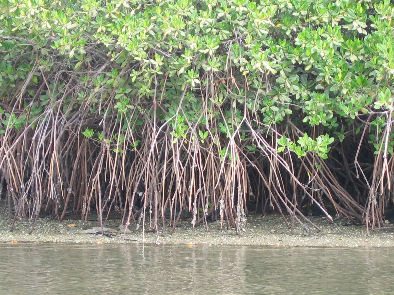 une île artificielle constituée d'amoncellements de coquillages et reliée à la côte par un pont de bois.