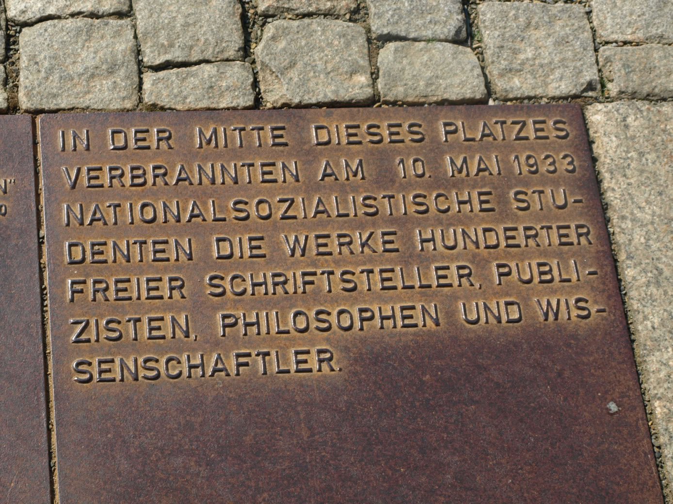 "Au milieu de cette place, le 10 mai 1933, des étudiants national-socialistes brulèrent les oeuvres de centaines d'écrivains, journalistes, philosophes et scientifiques"