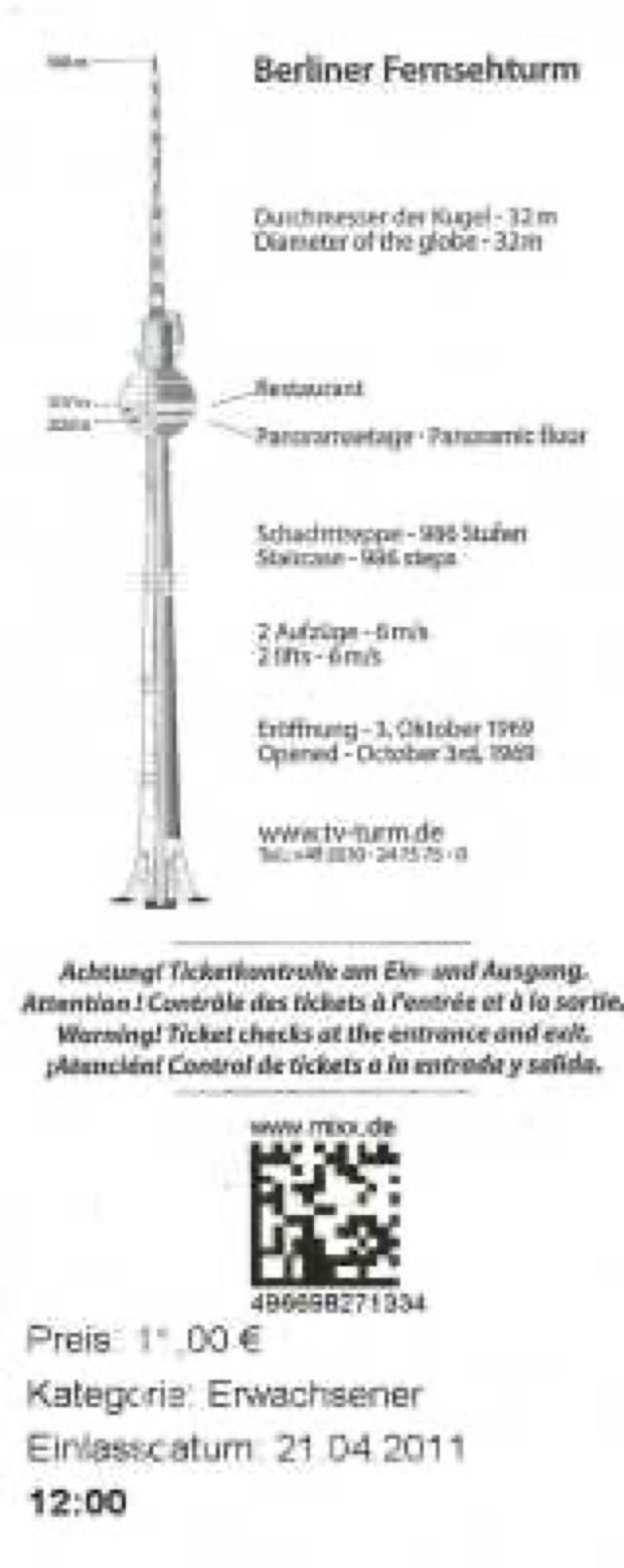 Avais réservé via internet un déjeuner dans la tour. Le restaurant panoramique situé dans la boule (à 207m) pivote en 30mn. Excellent moyen pour avoir une vision de Berlin à 360°...