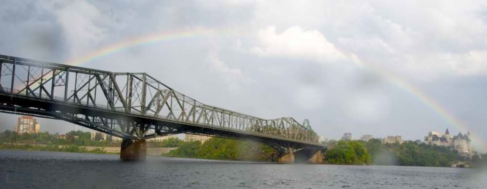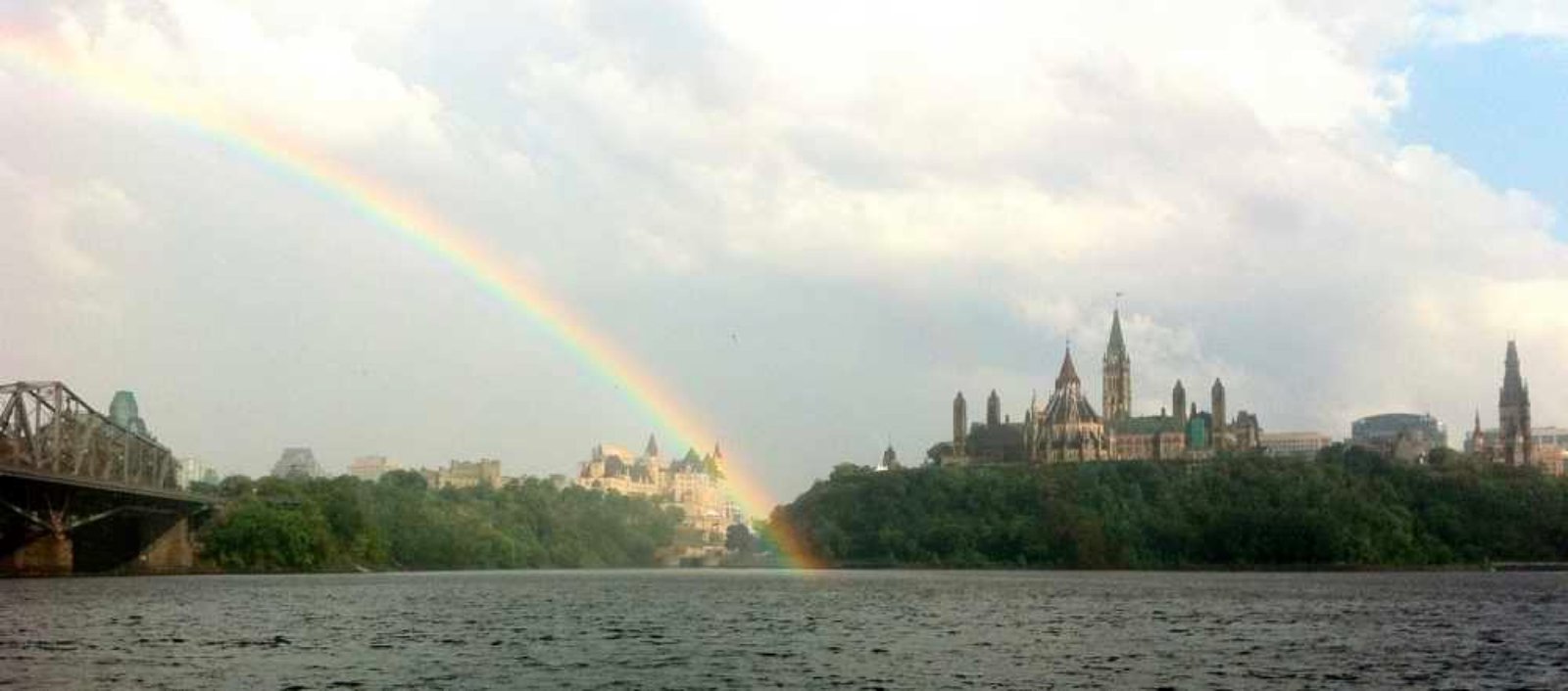 Avons ensuite flâné dans les rues à la découverte du marché aux fruits et aux fleurs, de la Basilique-cathédrale Notre-Dame (sommes tombés au moment d'un mariage de la haute bourgeoisie locale). Avons traversé un pont qui nous a permis d'avoir une vue superbe sur la ville et sommes rentrés en taxi aquatique (Sté créée par un frenchie). C'est à ce moment précis qu'un orage et une pluie torrentielle se sont abattus sur Ottawa. Quelques minutes plus tard, le soleil et un superbe arc en ciel apparaissaient. Génial.
