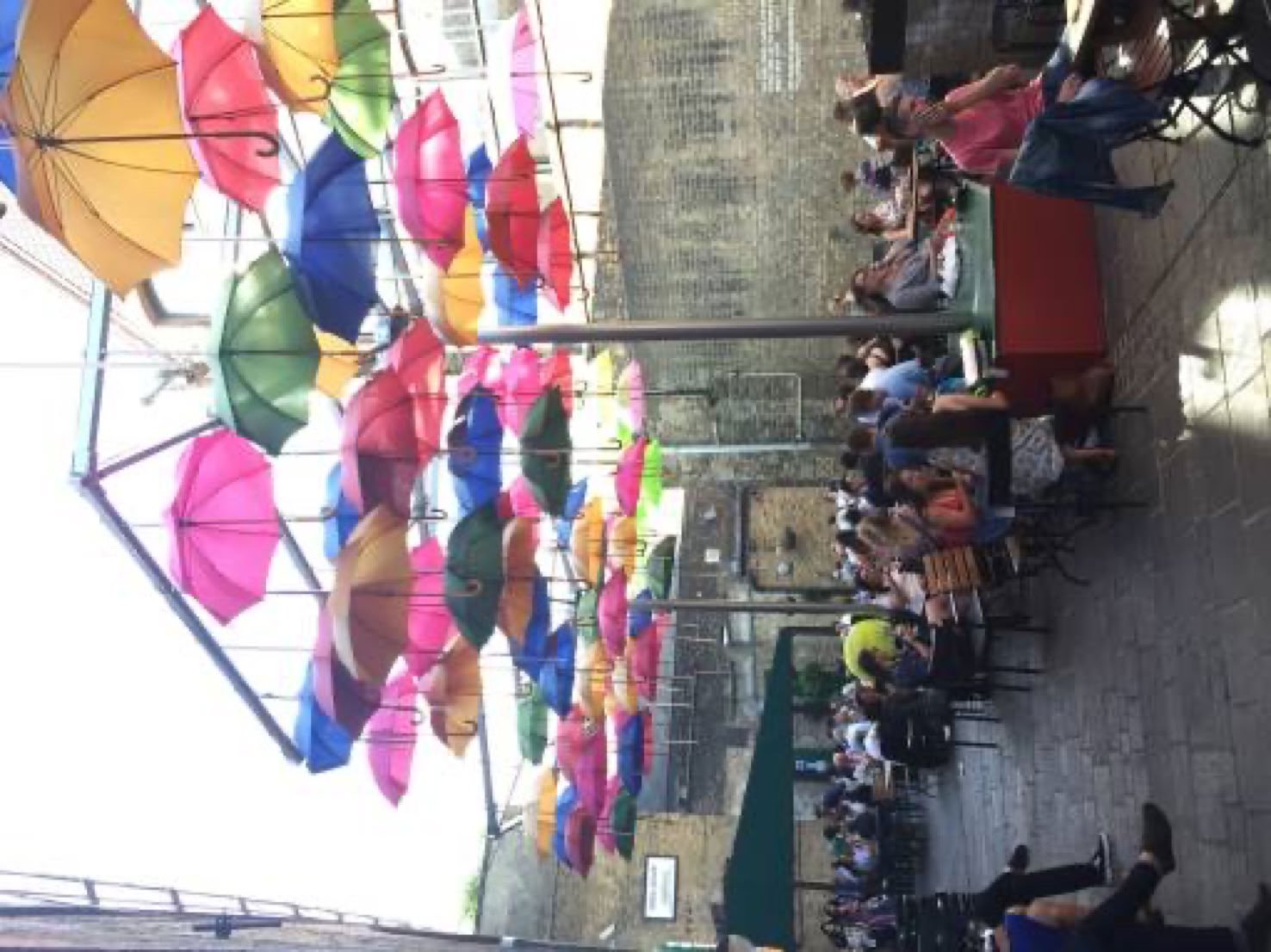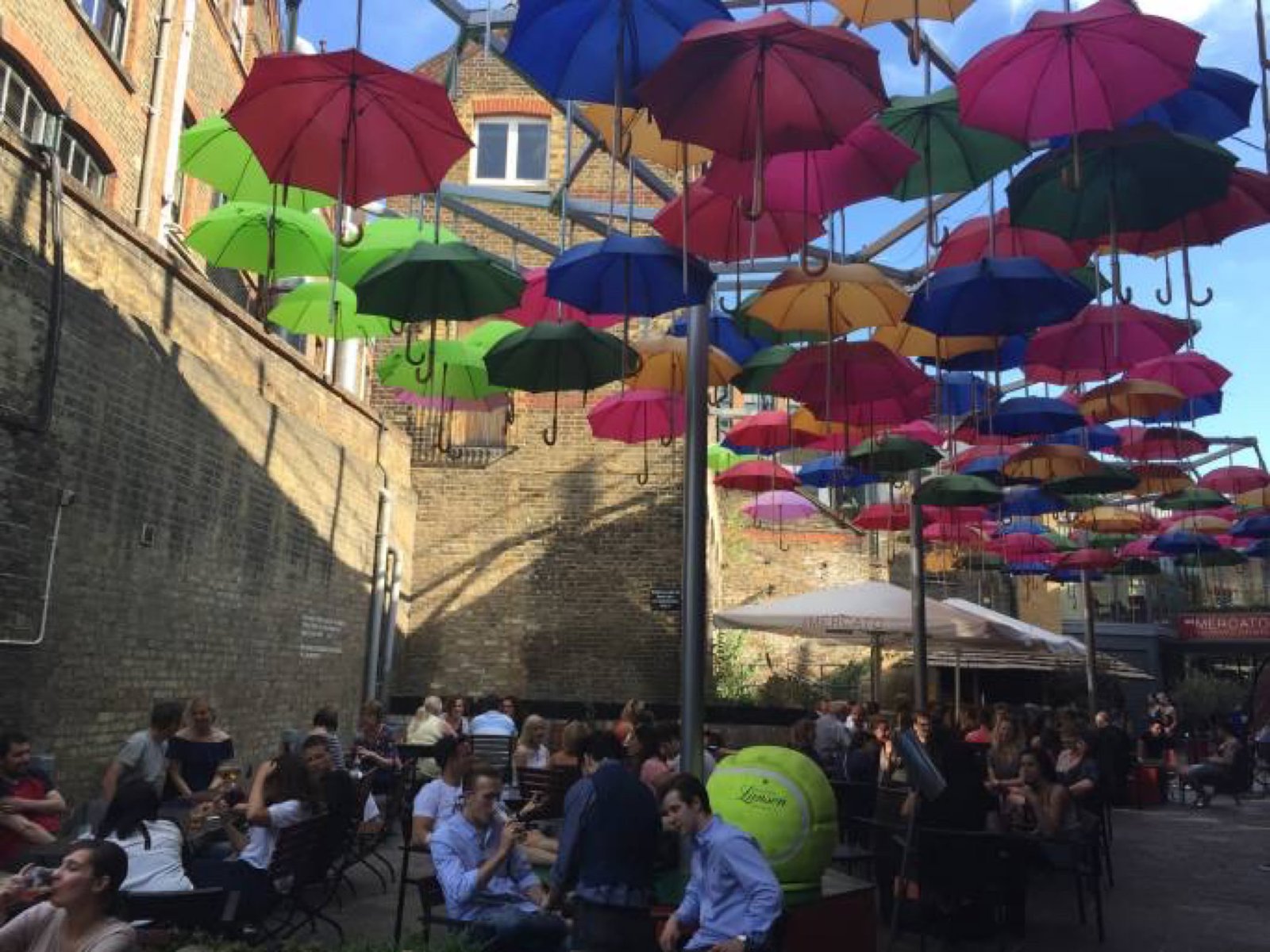 Joli bar extérieur décoré avec des parapluies multicolores suspendus.