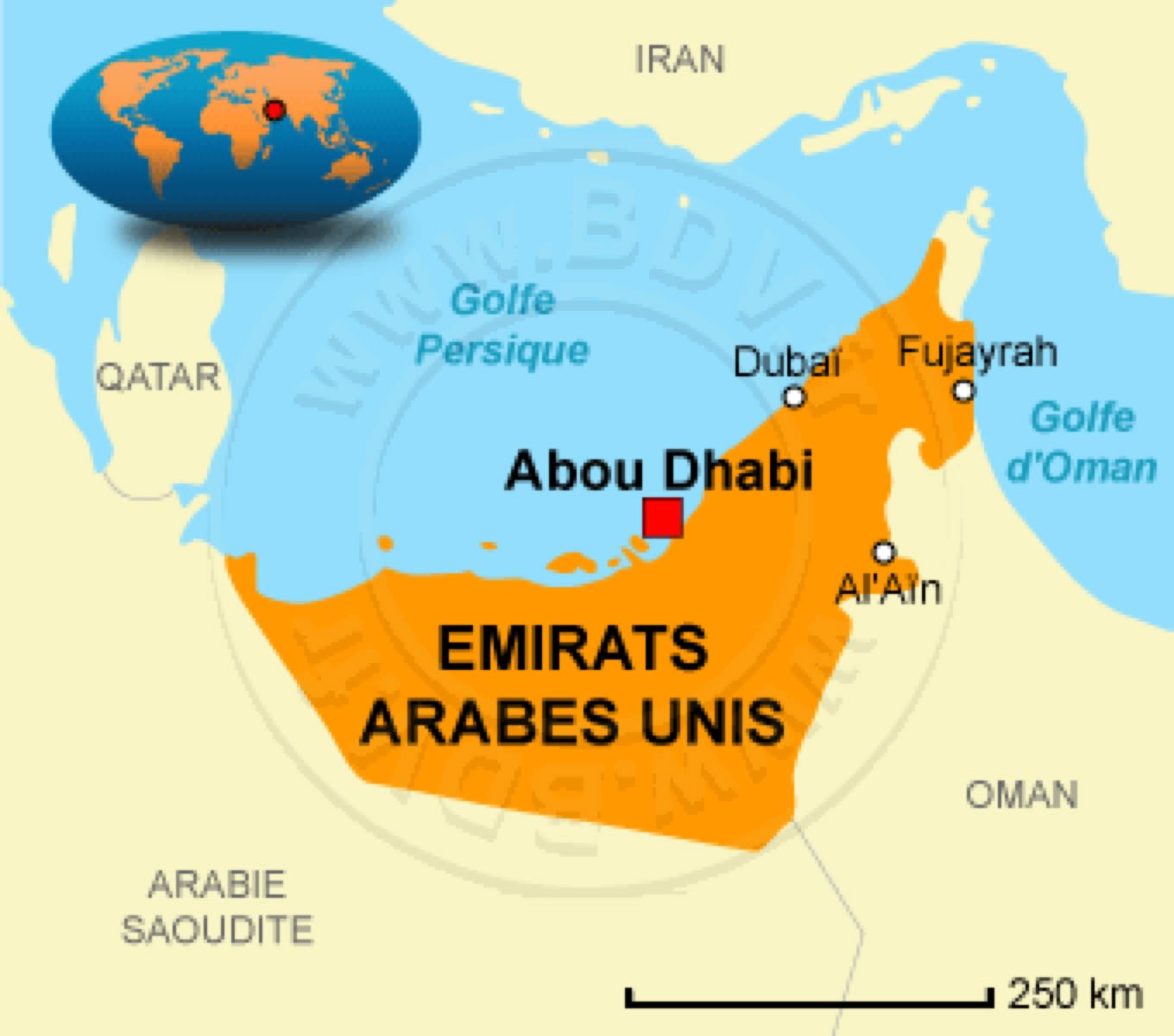 Créés en 1971, les Emirats Arabes Unis regroupent sept émirats : ceux d'Abou Dabi, d'Ajman, de Charjah, de Dubaï, de Fujaïrah, de Ras el Khaïmah et d'Oumm al Qaïwaïn. Ils sont situés entre le golfe Persique et le golfe d'Oman.