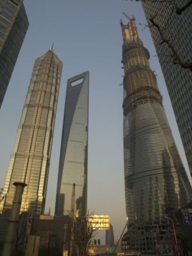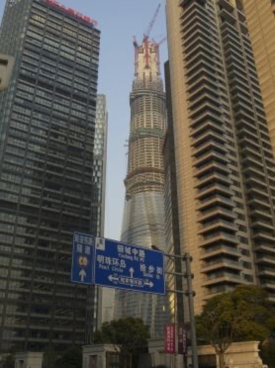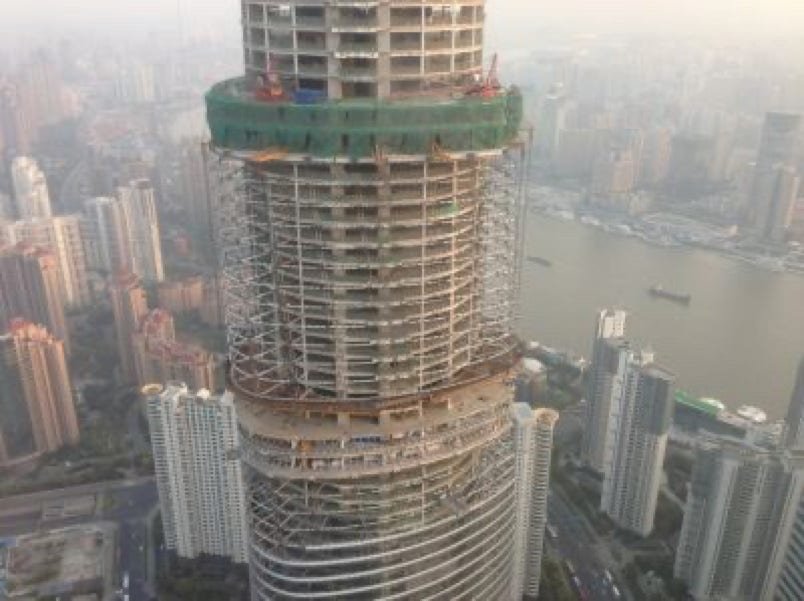 La Tour Shanghai en construction; bâtiment qui à terme s’élèvera à 632 mètres, aura 127 étages et développera une surface de 380 000 mètres carrés, sera le plus haut de Chine ainsi que le deuxième plus haut du monde après le Burj Khalifa de Dubaï