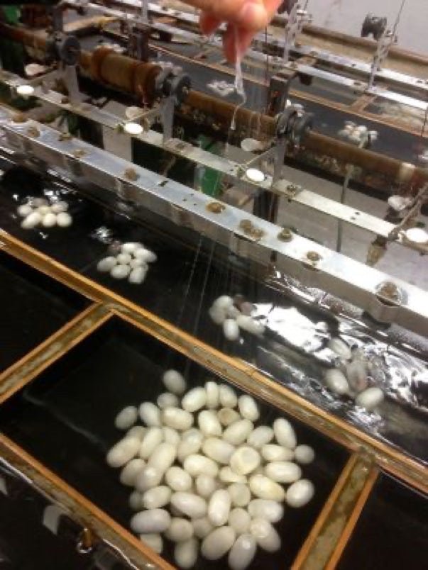 Les cocons sont d'abord triés. Les cocons sont ensuite étouffés dans des étuves de 70 à 80 °C, puis trempés dans l'eau bouillante pour que la colle naturelle protégeant les brins se ramollisse.