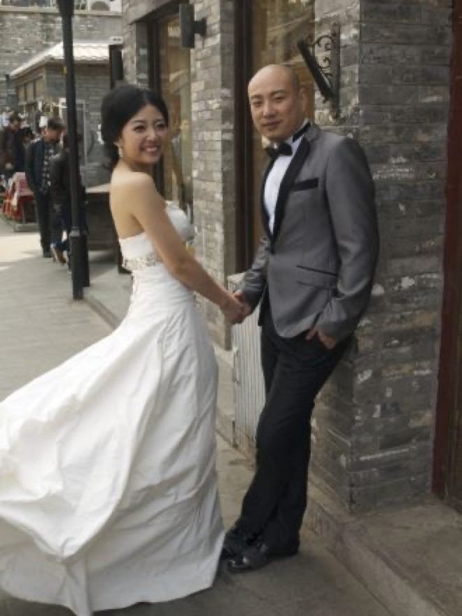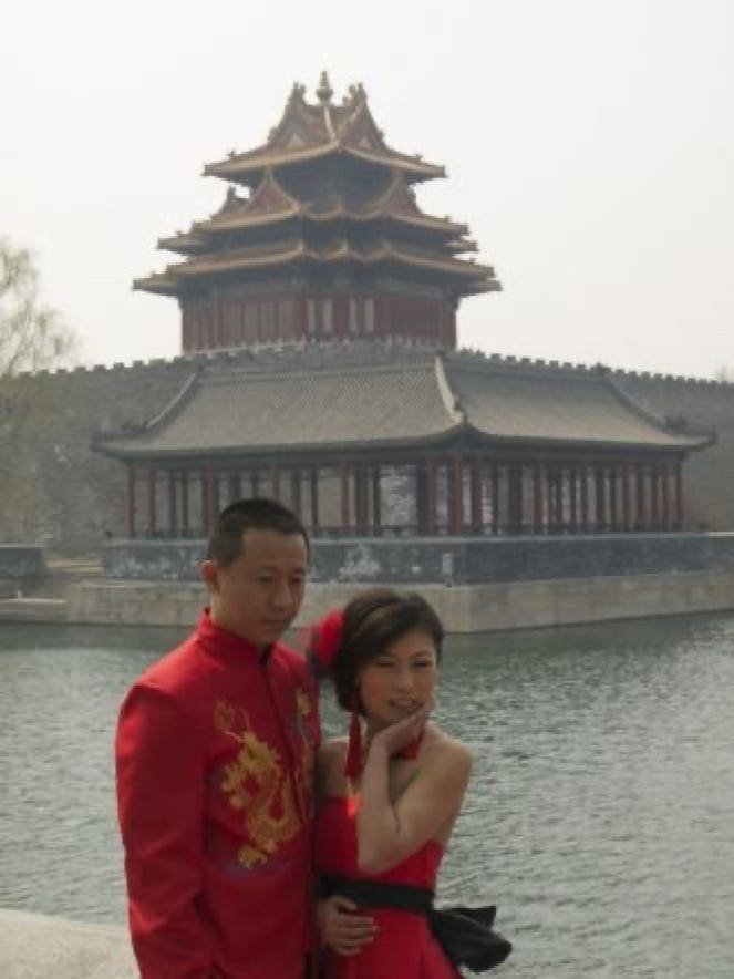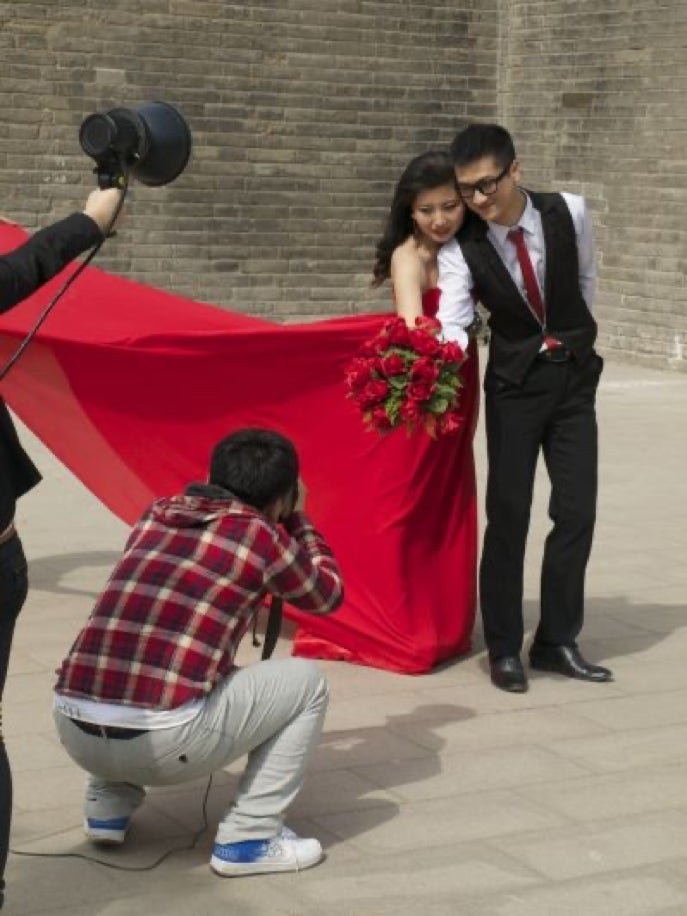 Séance de photos pour jeunes mariés près de la Cité Interdite. En Chine, les mariées sont habillées soit en rouge (couleur nationale), soit en blanc.