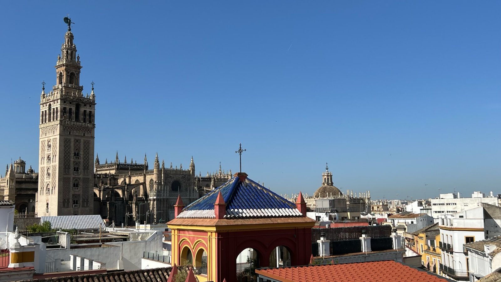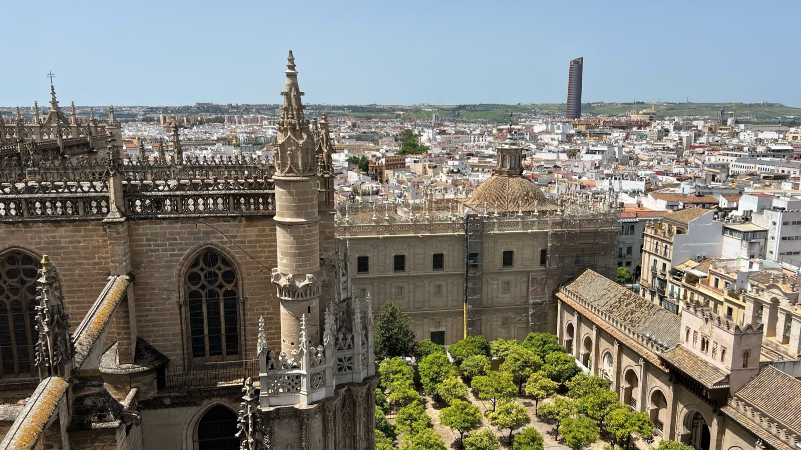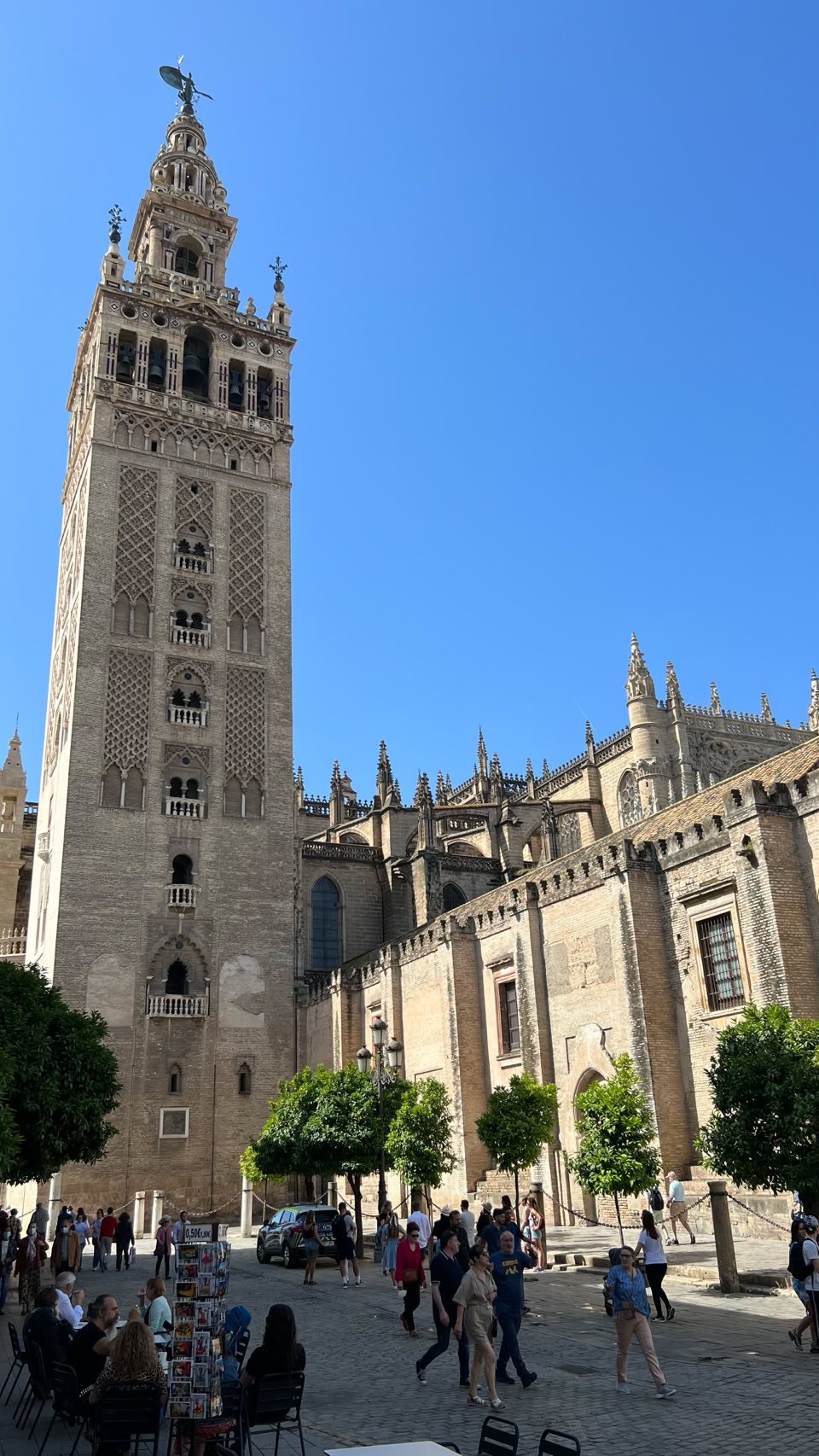 La Giralda est l'ancien minaret de la grande mosquée almohade de Séville. Après la reconquête de la ville, la mosquée a été convertie en cathédrale et la Giralda est devenue le clocher de la cathédrale.