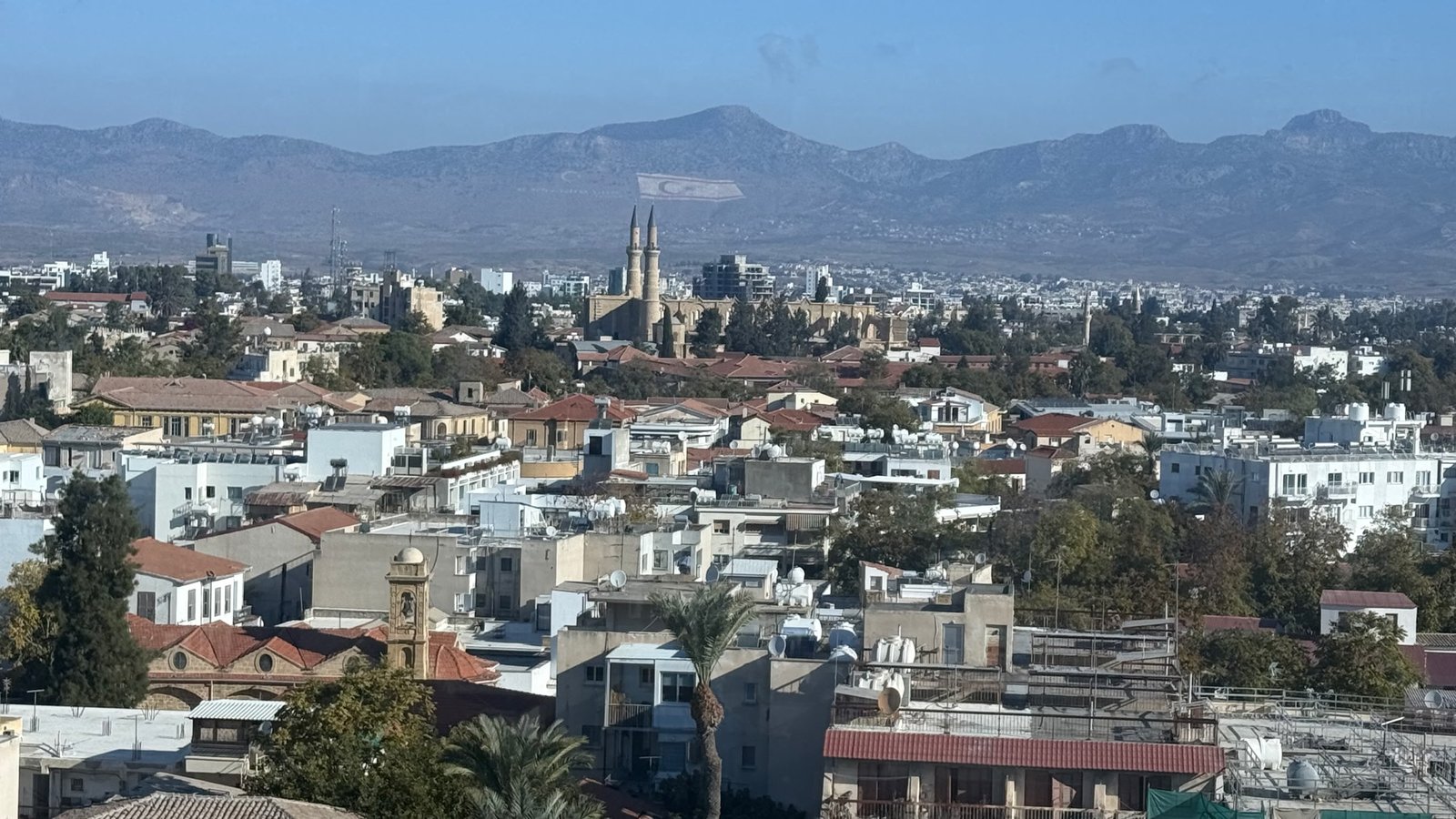 Vue de la salle de Restaurant. Notez le drapeau turc sur la montagne derrière la Mosquée. Indicateur de la tension qui règne entre les 2 parties de l’île.
