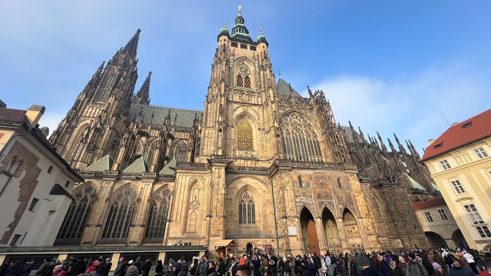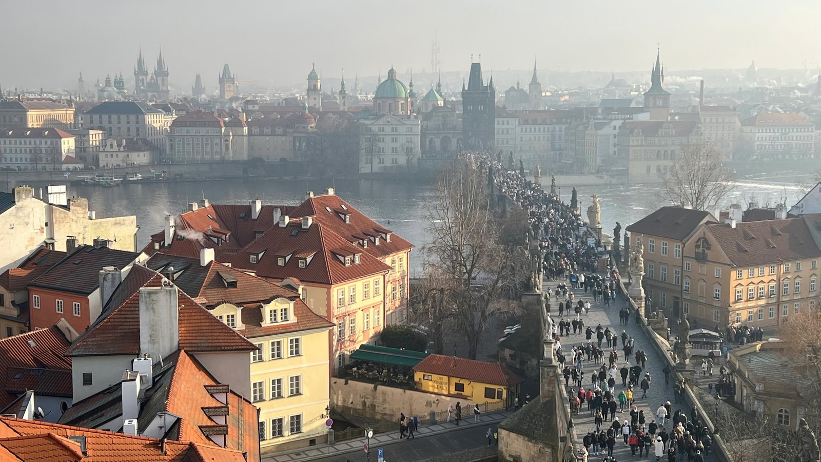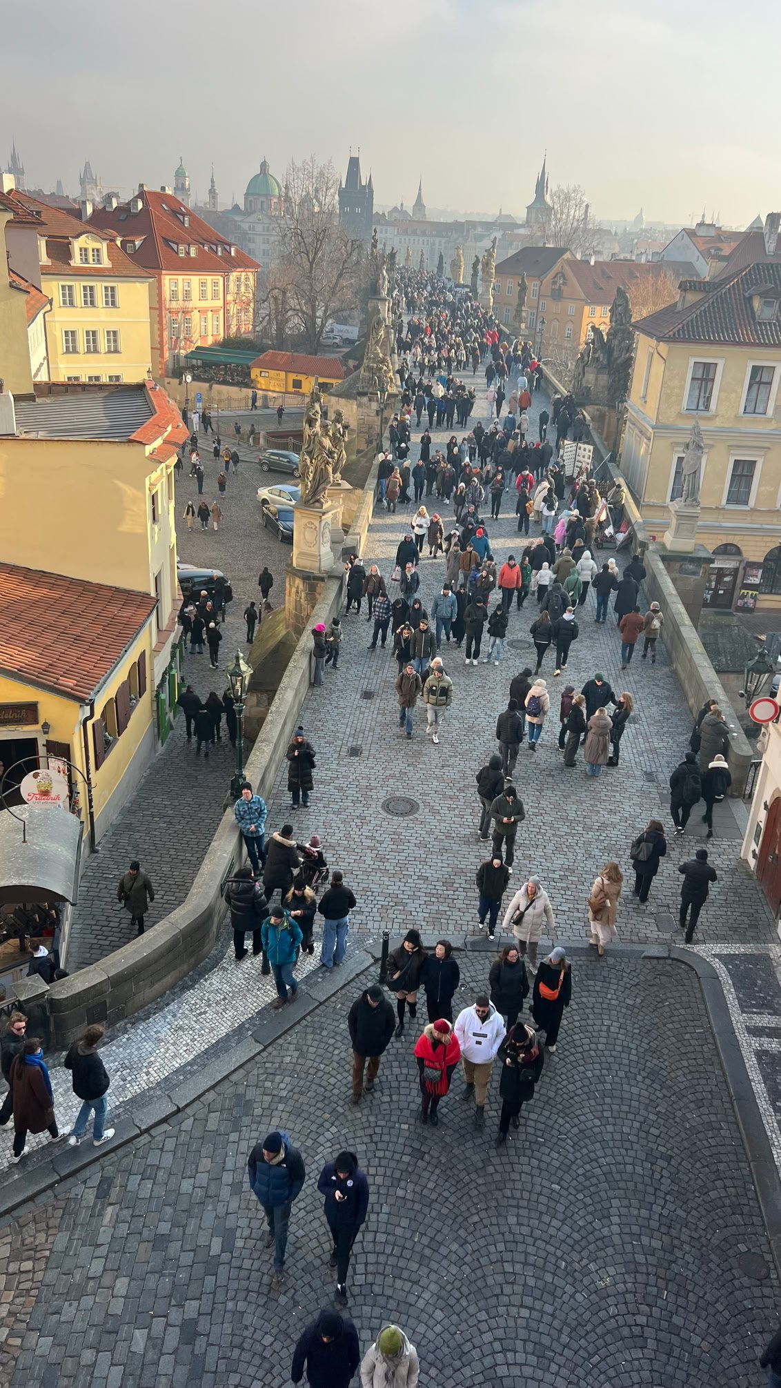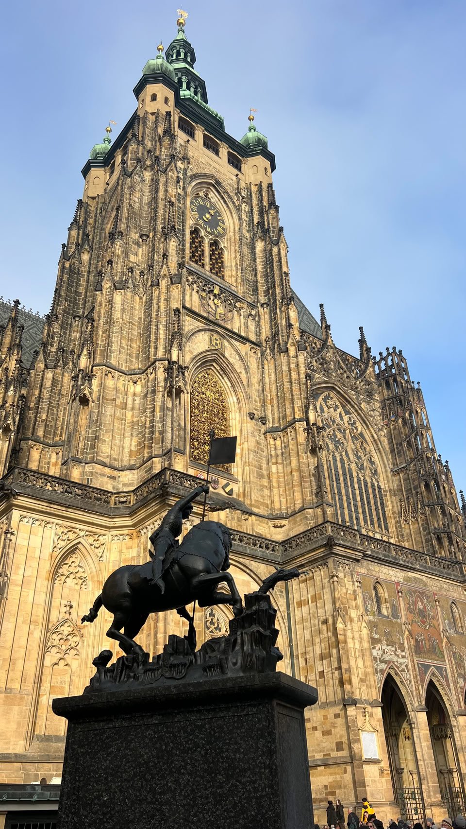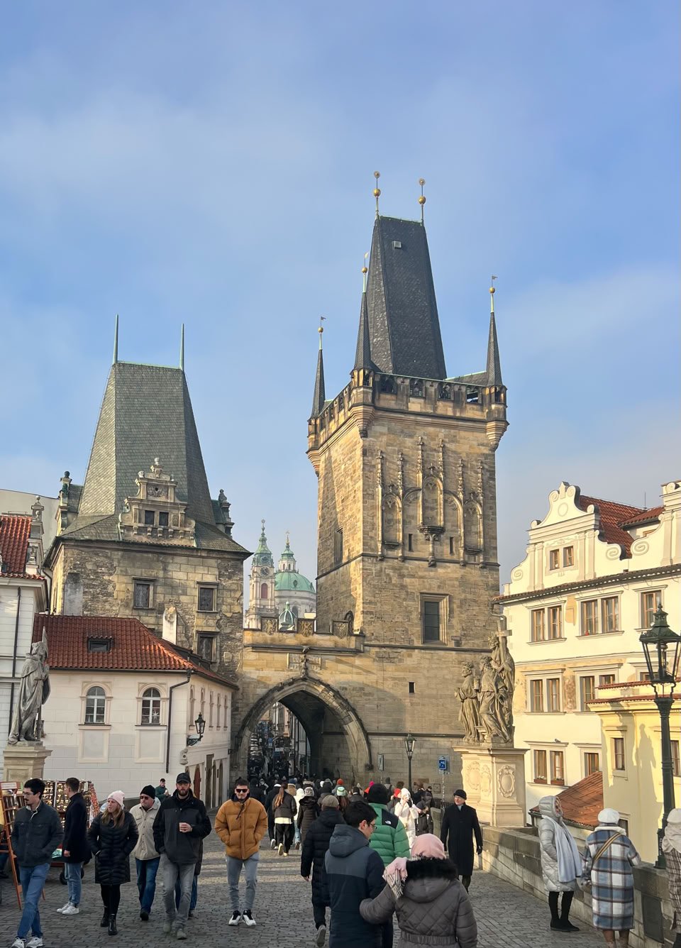 Nuit tranquille et petit-dej de qualité. Idéal pour partir à l’assaut de Prague. Au menu de ce jour : le Château, la Cathédrale, la Ruelle d’Or. Nous commençons par monter dans une tour près de notre hôtel pour avoir une belle vue sur le Pont Charles… très fréquenté.