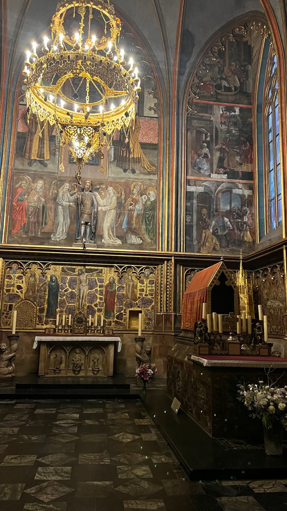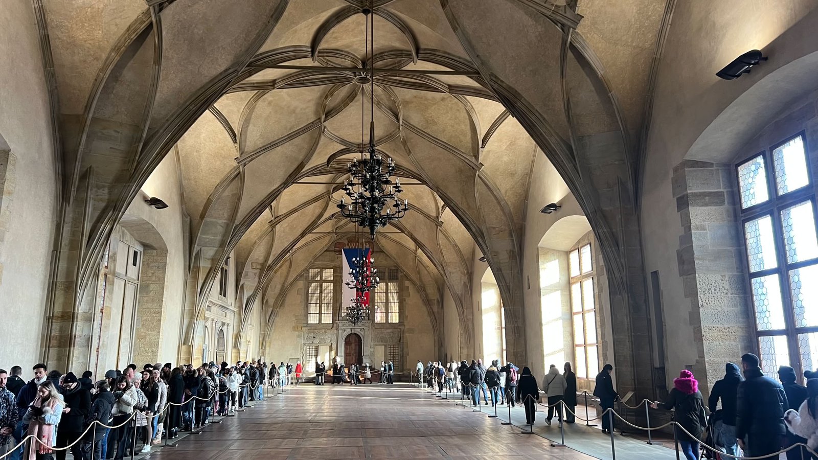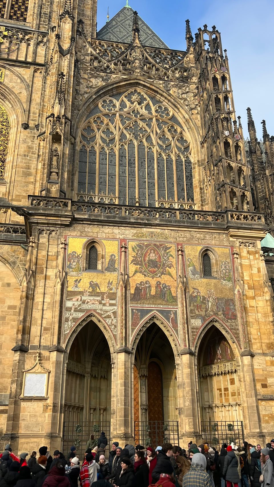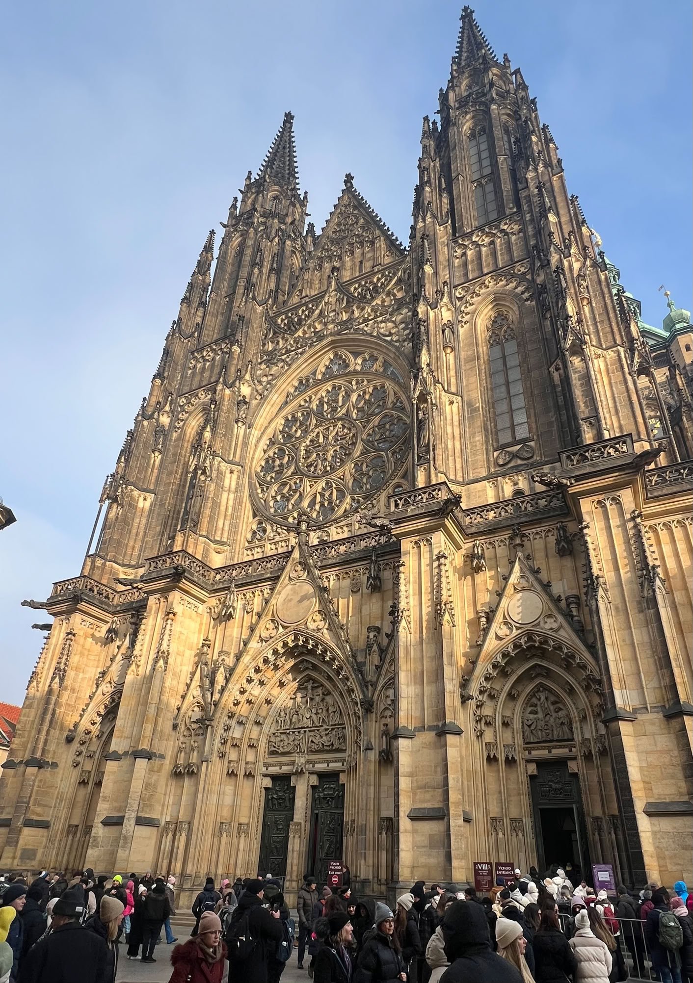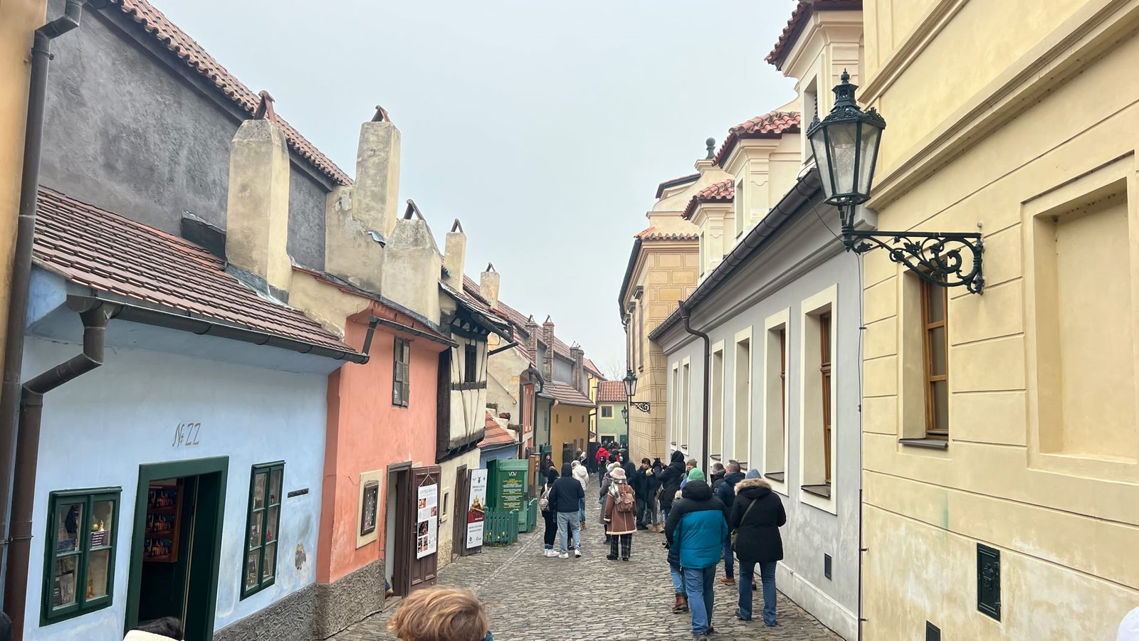 Nuit tranquille et petit-dej de qualité. Idéal pour partir à l’assaut de Prague. Au menu de ce jour : le Château, la Cathédrale, la Ruelle d’Or. Nous commençons par monter dans une tour près de notre hôtel pour avoir une belle vue sur le Pont Charles… très fréquenté.