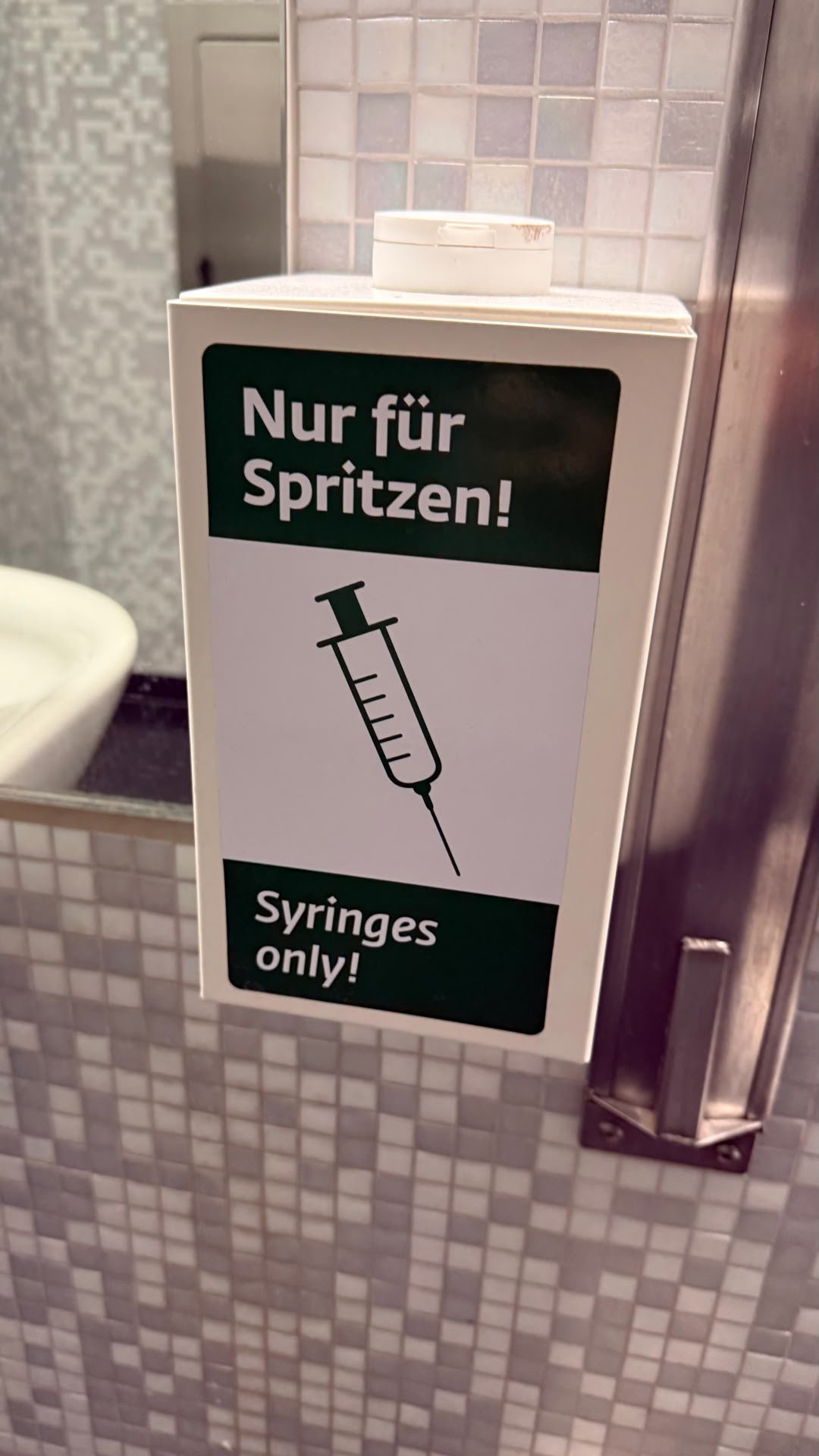 Particularité déjà vue à Genève : Boite pour collecter les seringues dans les sanitaires. Etonnant