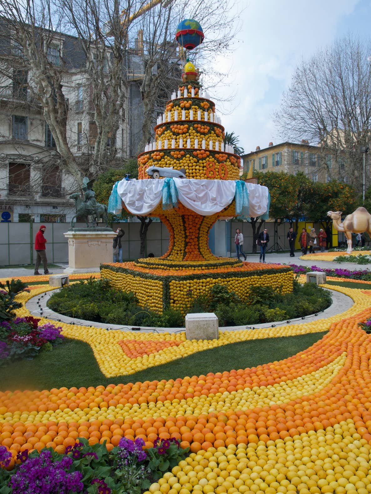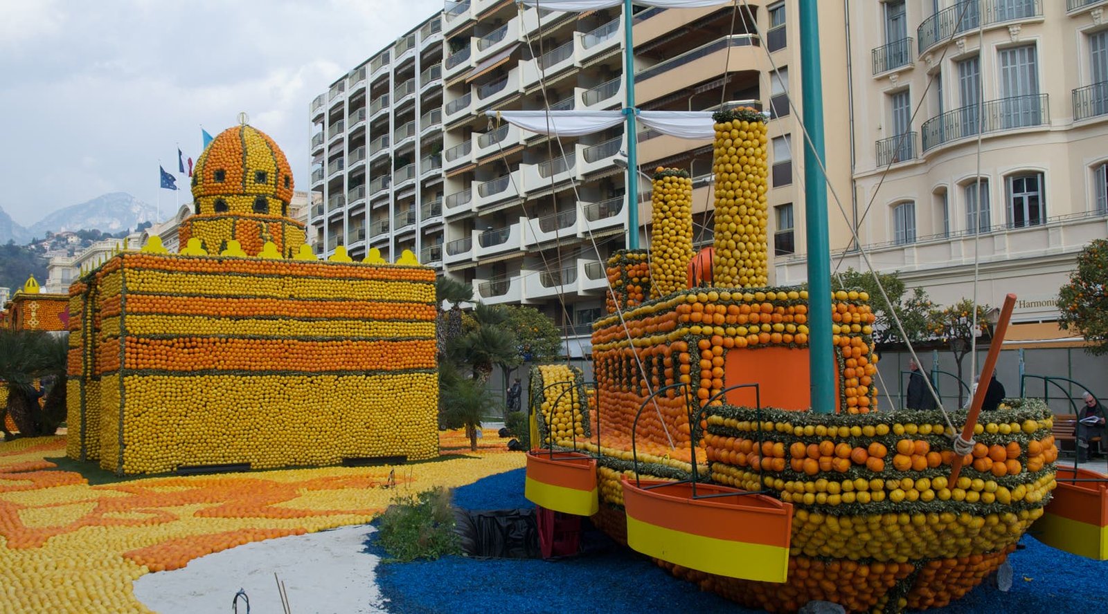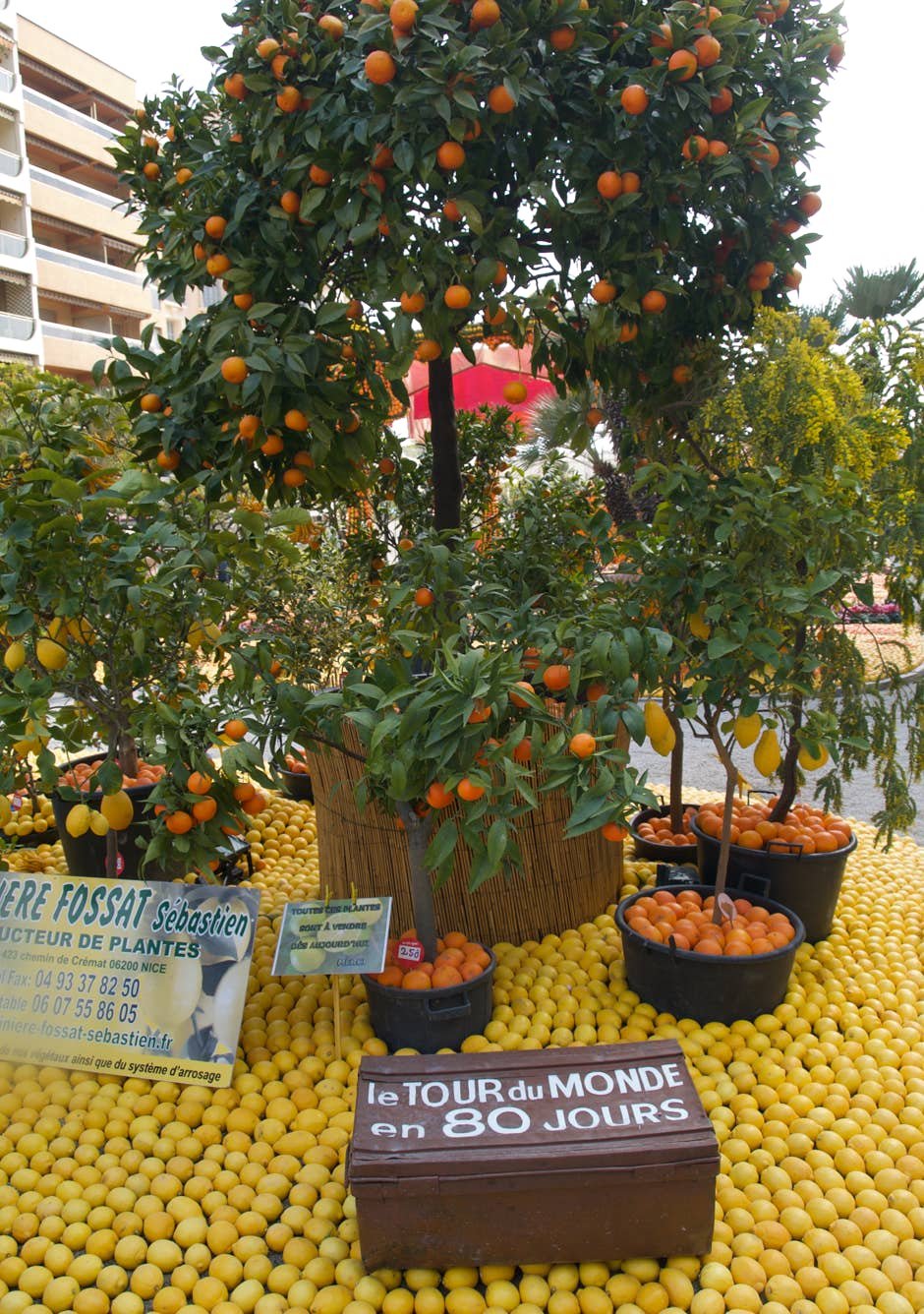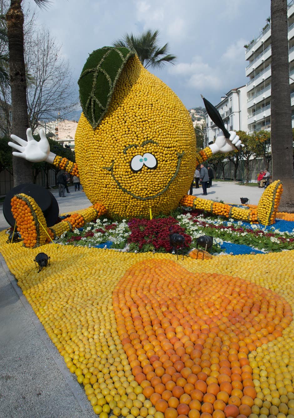 Expo sur le thème du "Voyage au tour du Monde" avec des oeuvres composées d'oranges et de citrons. Original.