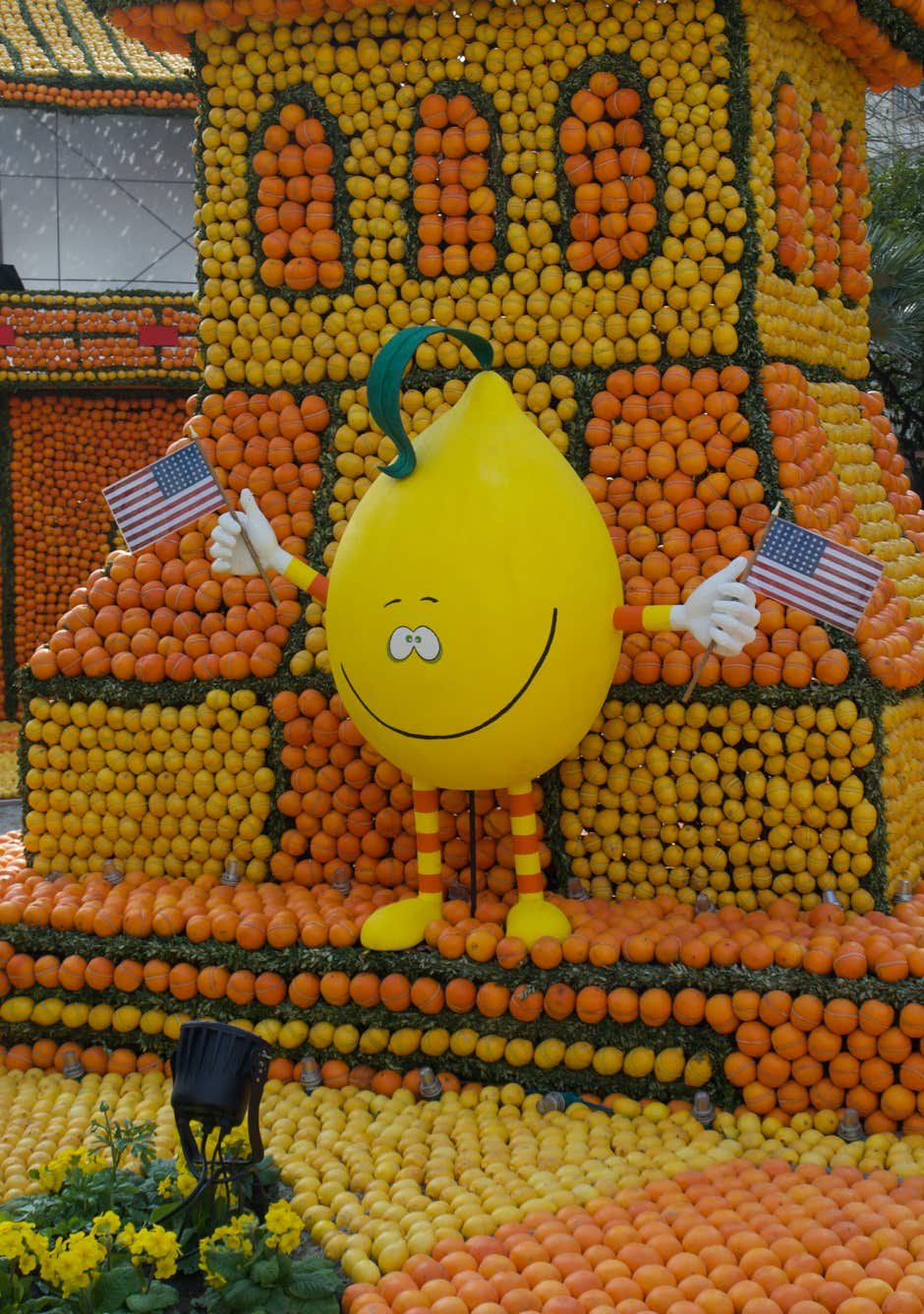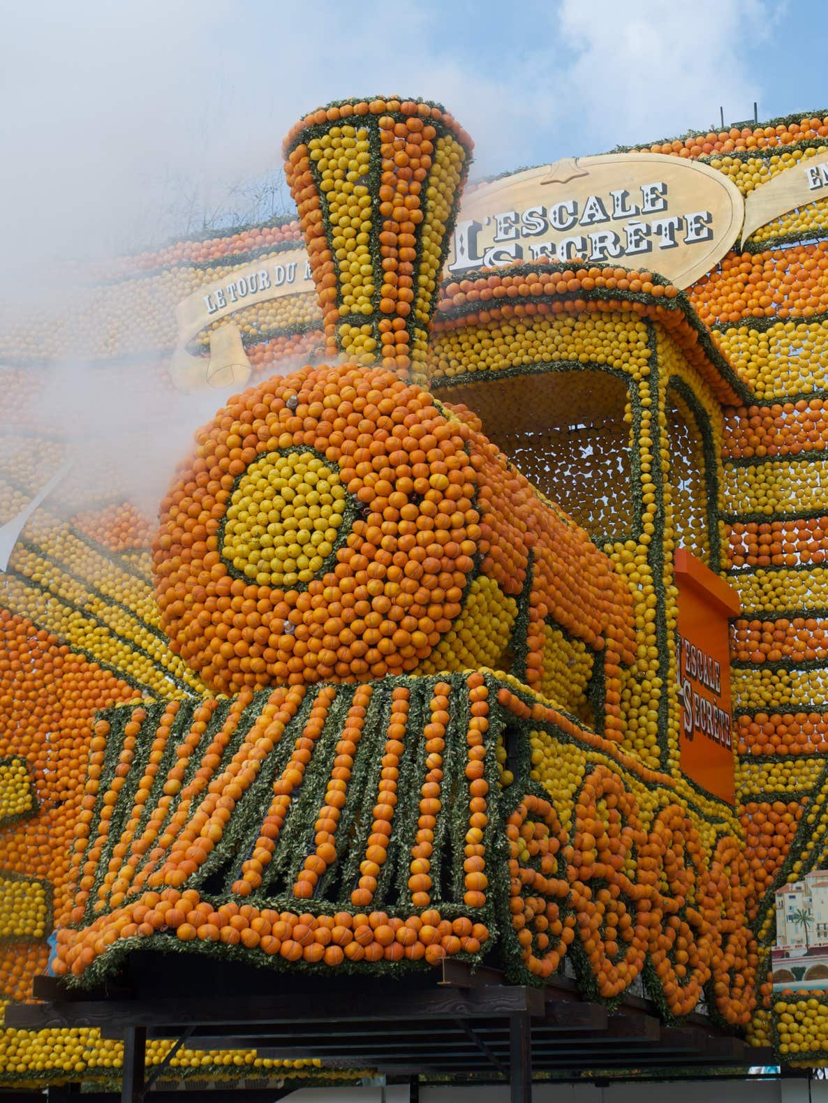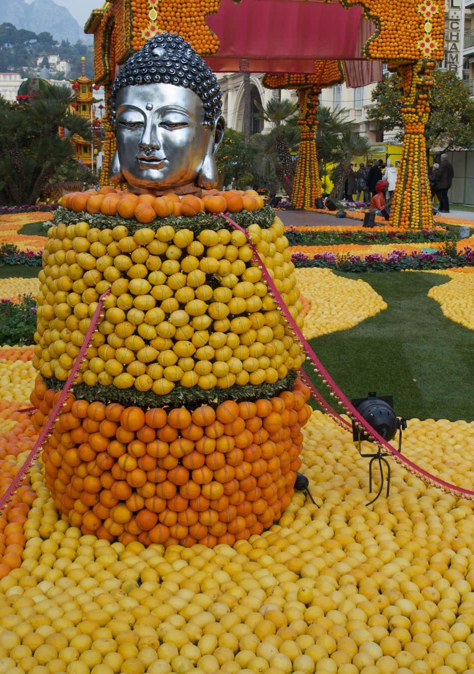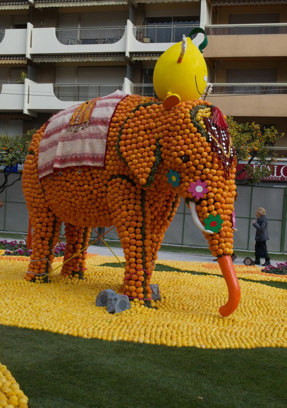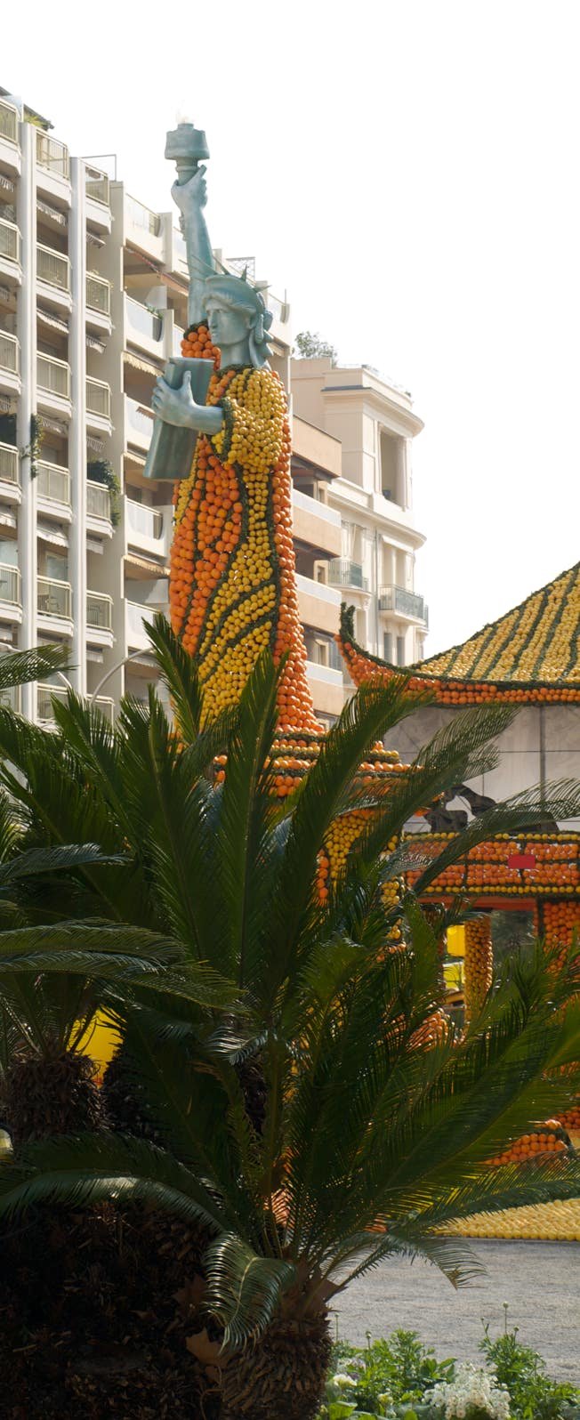 Expo sur le thème du "Voyage au tour du Monde" avec des oeuvres composées d'oranges et de citrons. Original.