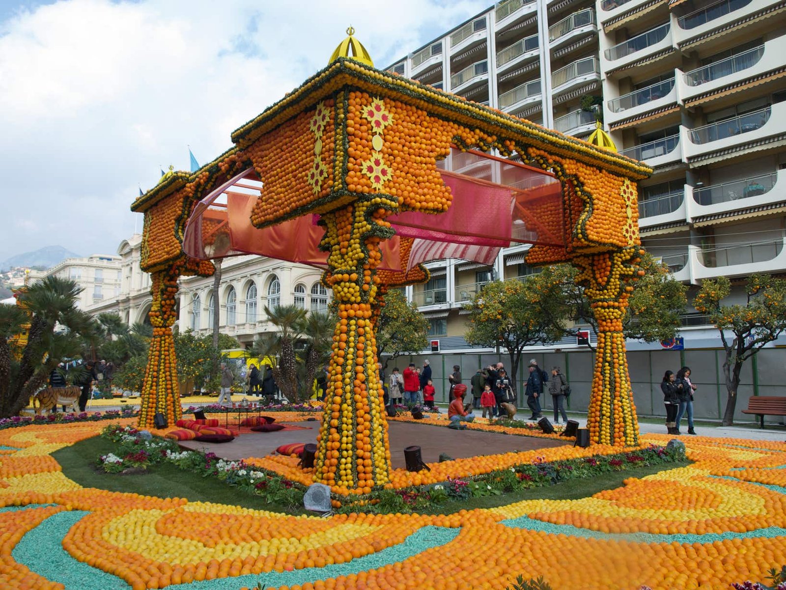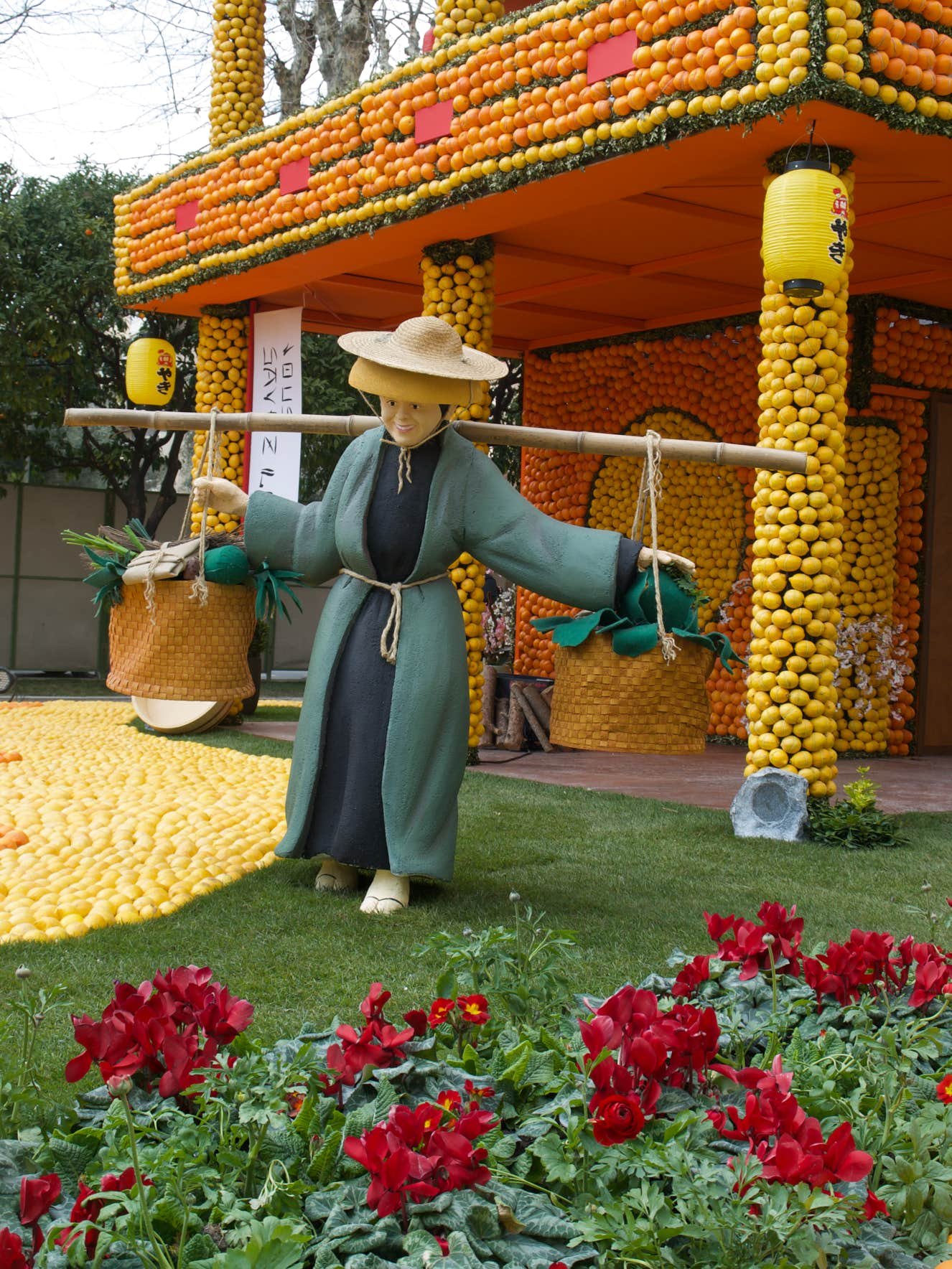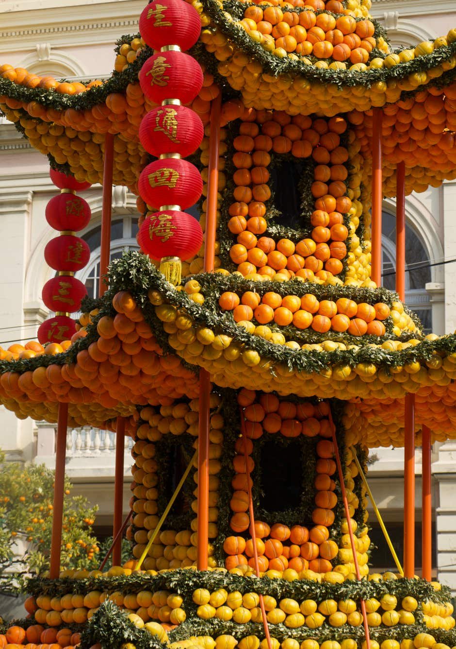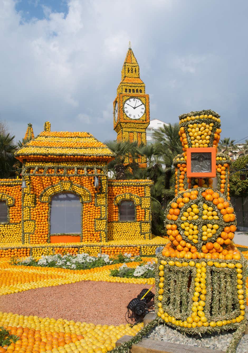 Expo sur le thème du "Voyage au tour du Monde" avec des oeuvres composées d'oranges et de citrons. Original.