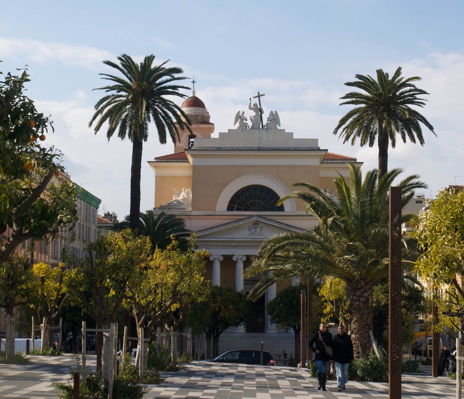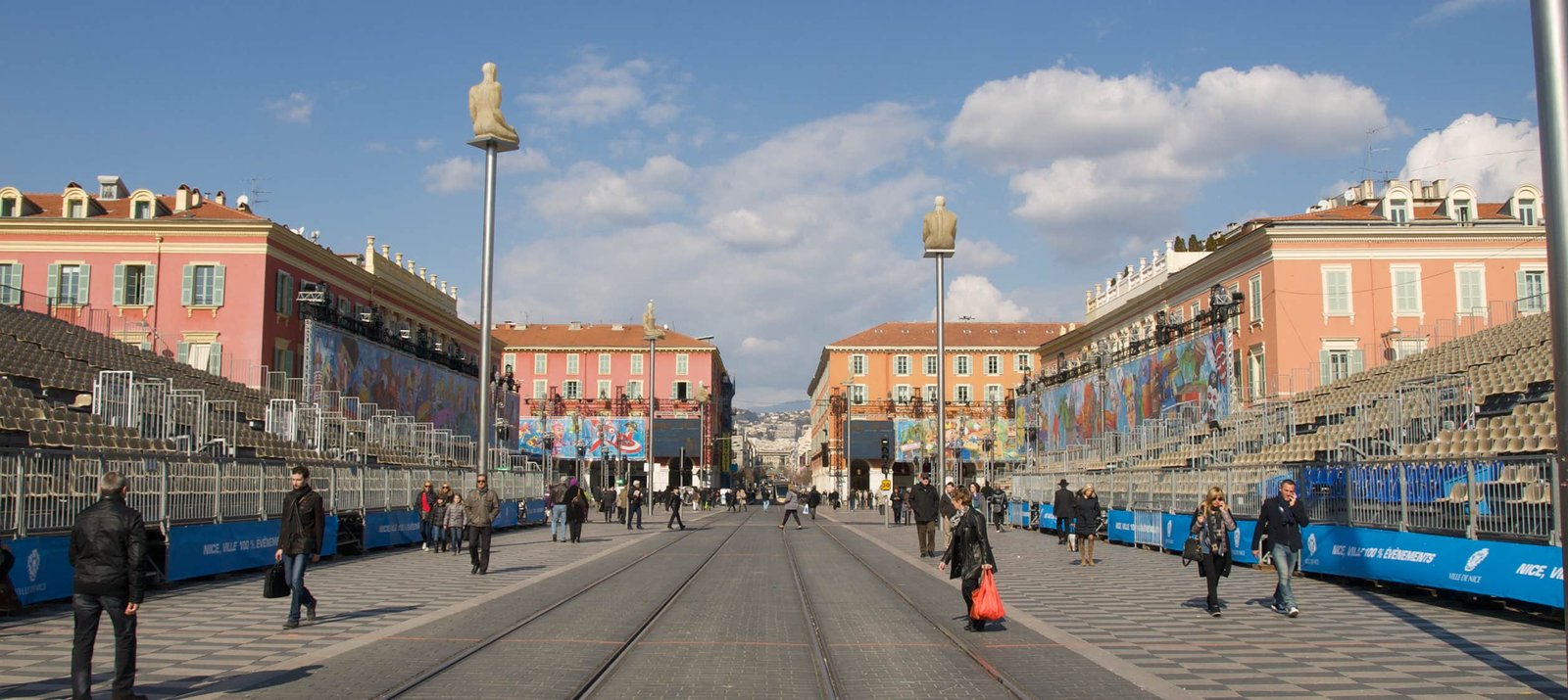 La Place Massena avec ses 7 figures (éclairées le soir) qui représentent les différents continents. Elles invitent à lever les yeux et redécouvrir le ciel niçois.