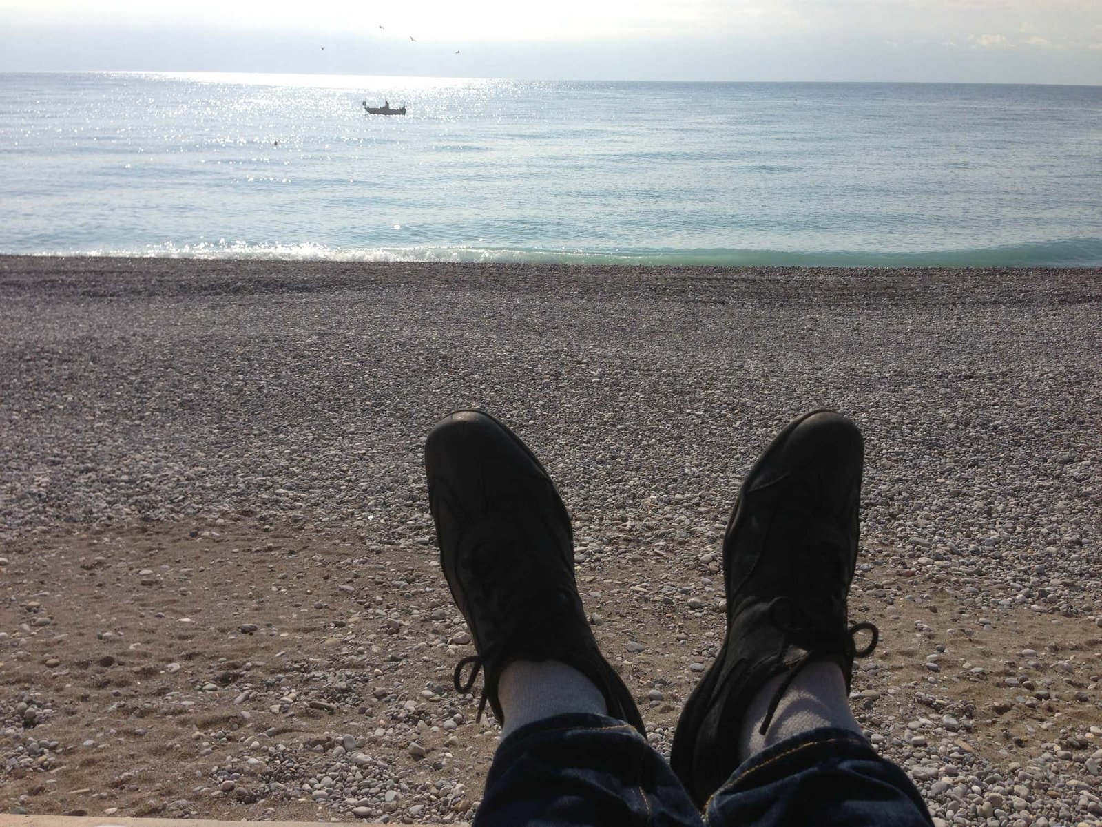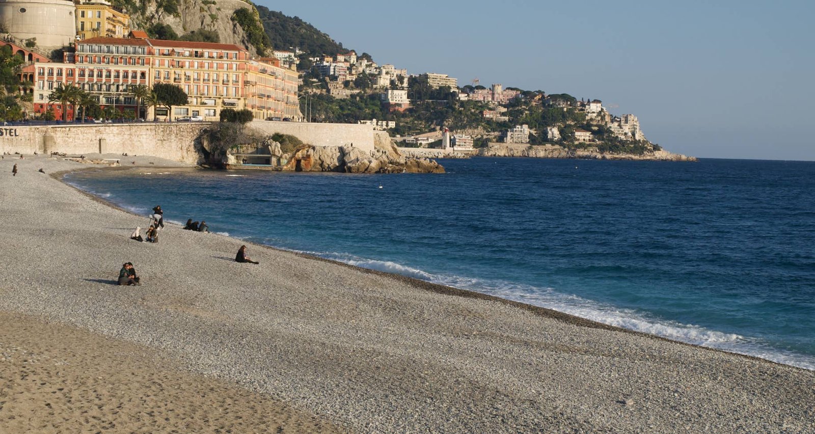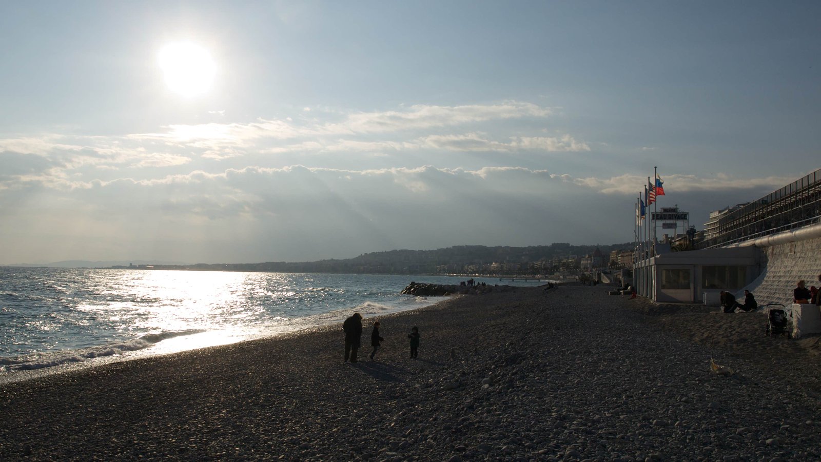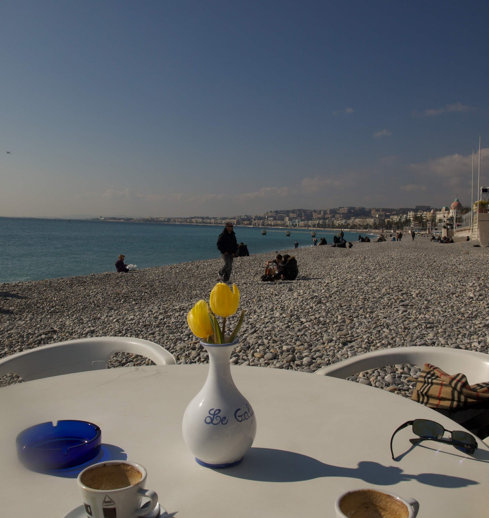 Nice, c'est bien sur aussi la plage. Inconfortable avec ses galets qui font mal aux fesses et aux pieds... Mais quelle jolie baie. Agréable en ce mois de février de boire une boisson CHAUDE assis à une terrasse de café désertée par le public.