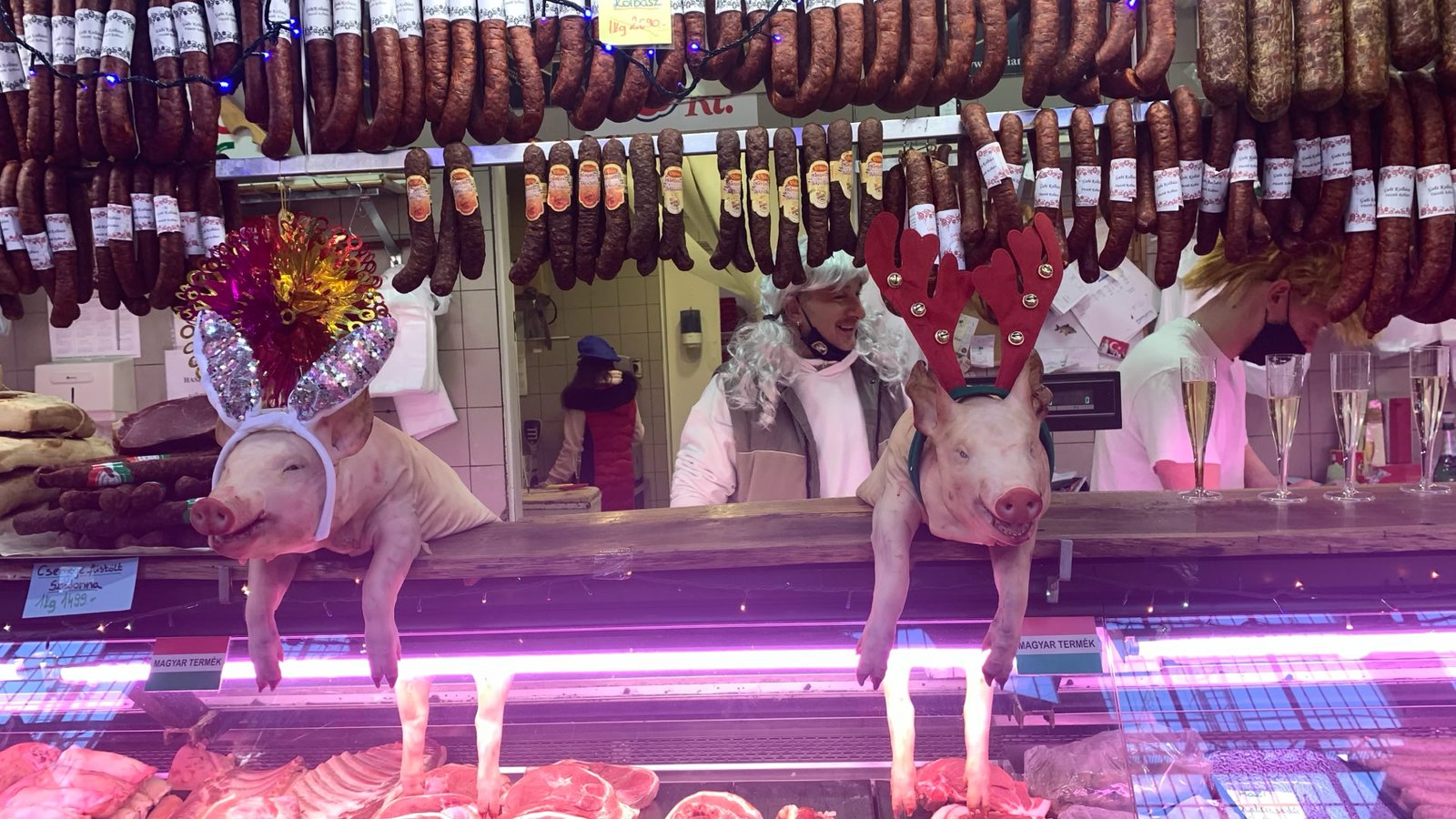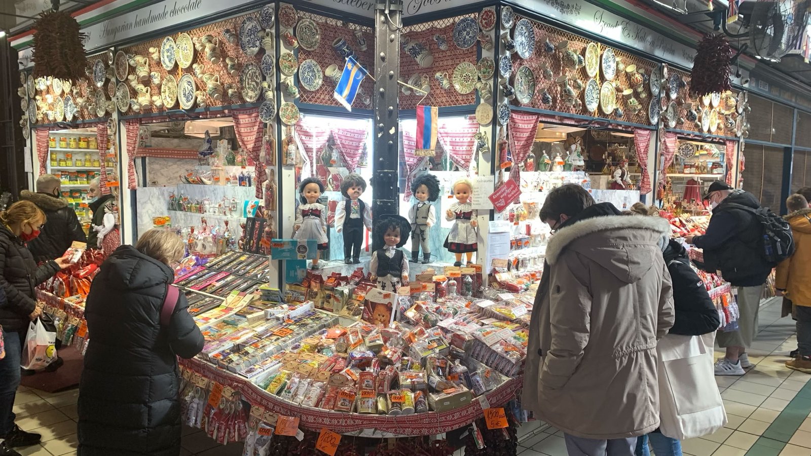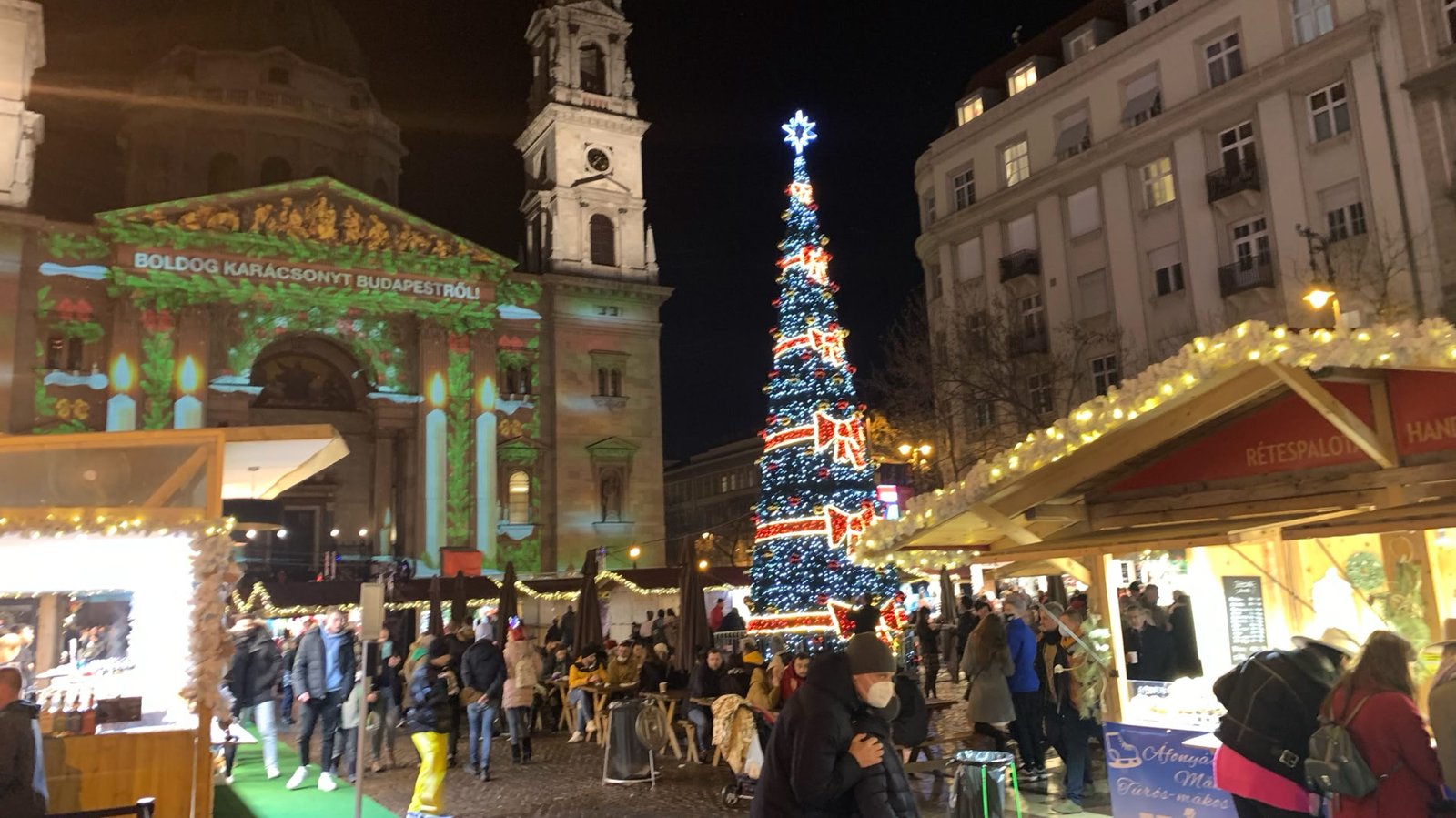 Pour le réveillon, nous n’avions rien réservé. Nous pensions profiter des différents marchés extérieurs proposant différents types de bouffe. Malheureusement, avec le COVID, beaucoup de ces marchés étaient fermés. Nous nous sommes rabattus sur celui situé à proximité de la Basilique Saint-Étienne. Beaucoup de choix mais peu de places disponibles sur les bancs. Nous avons toutefois réussi à trouver 2 places à côté de 5 autres personnes… russophones.