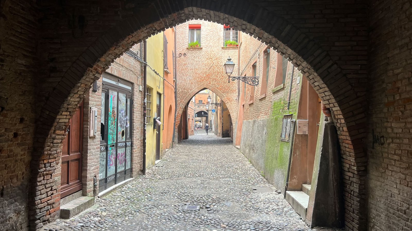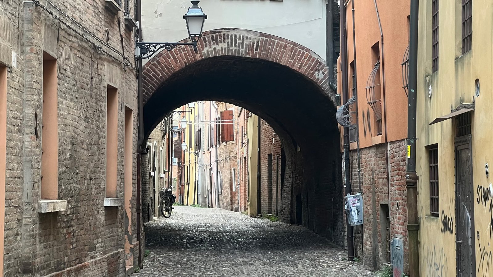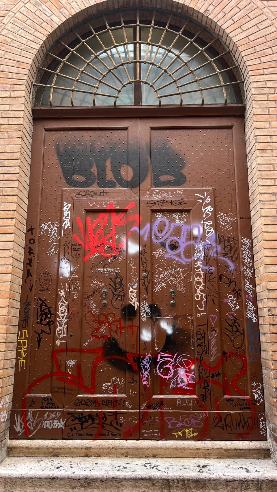 Ferrare, comme Bologne, voit fleurir des tags un peu partout… sur des beaux bâtiments voire même des monuments. On ne parle pas de StreetArt mais de déjections visuelles. Quel dommage tant l’architecture de ces villes est superbe. Un exemple avec cette porte souillée par des délinquants décérébrés.