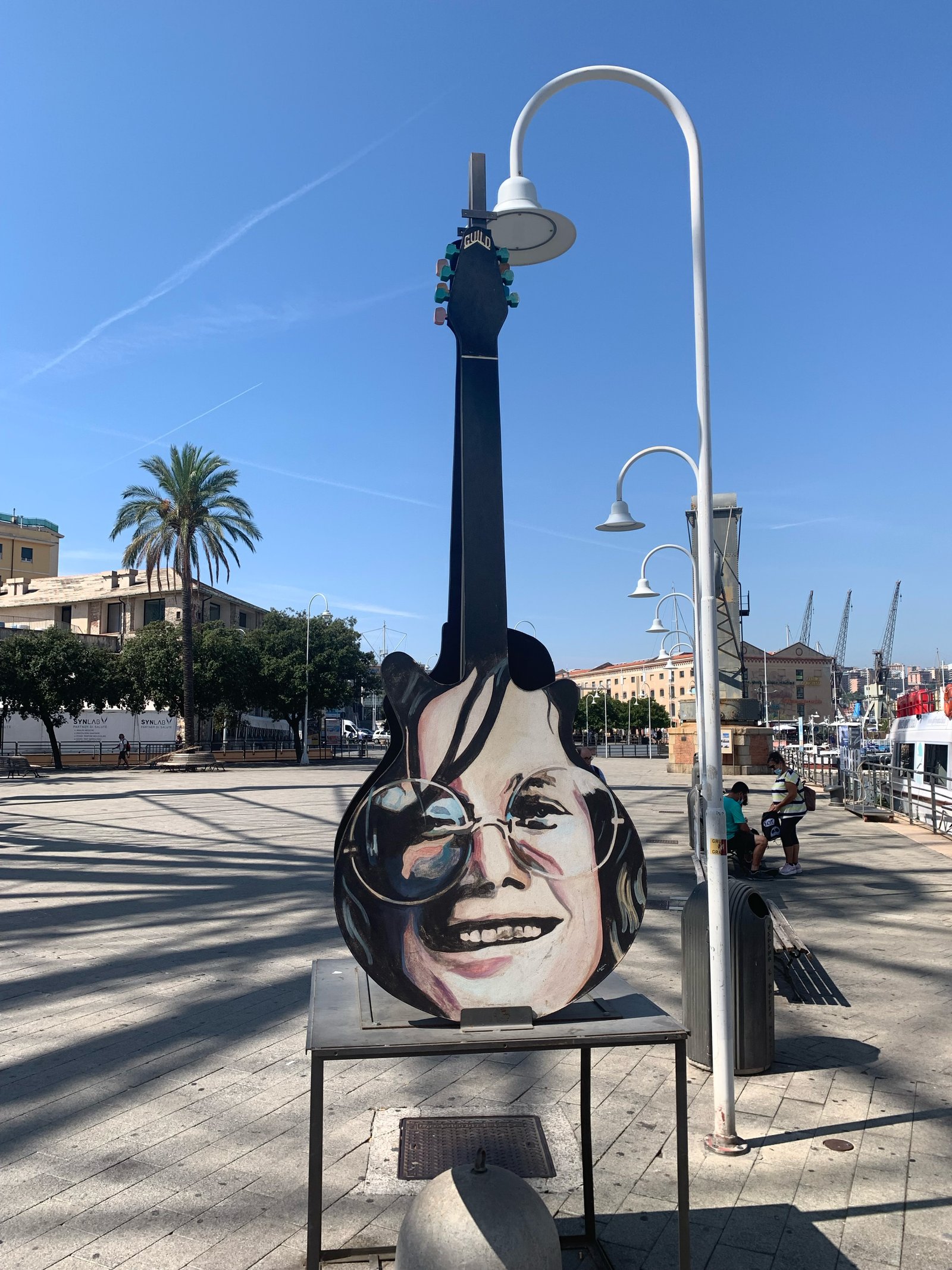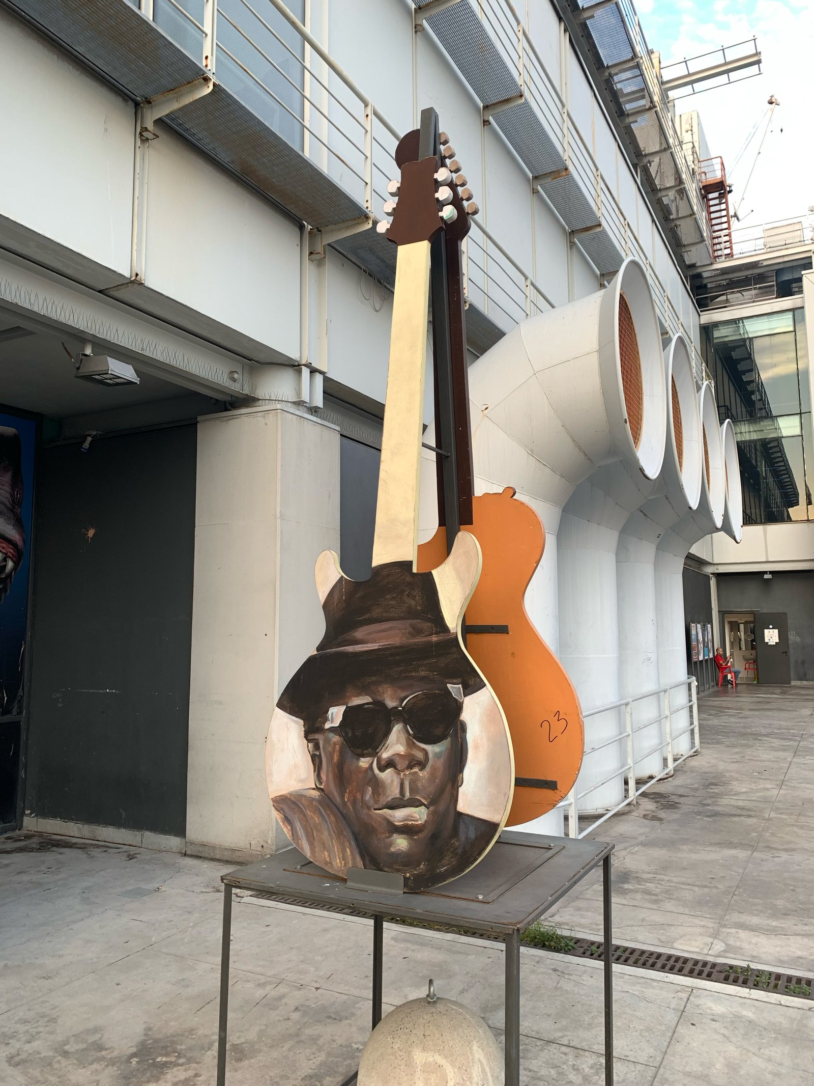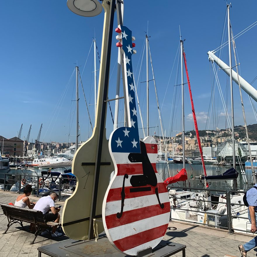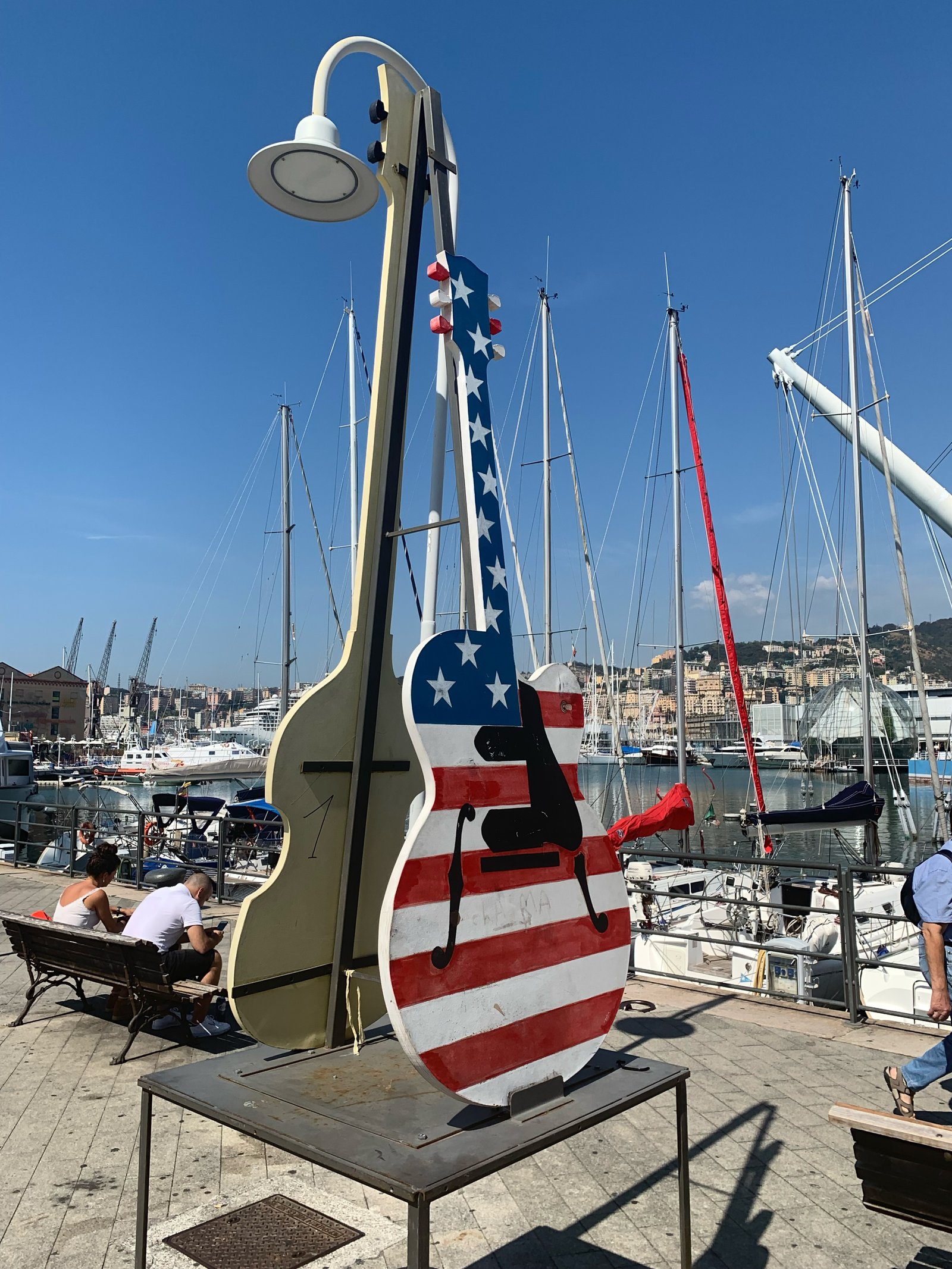 Quelques photos d'une expo à ciel ouvert sur le port présentant différentes guitares colorées.