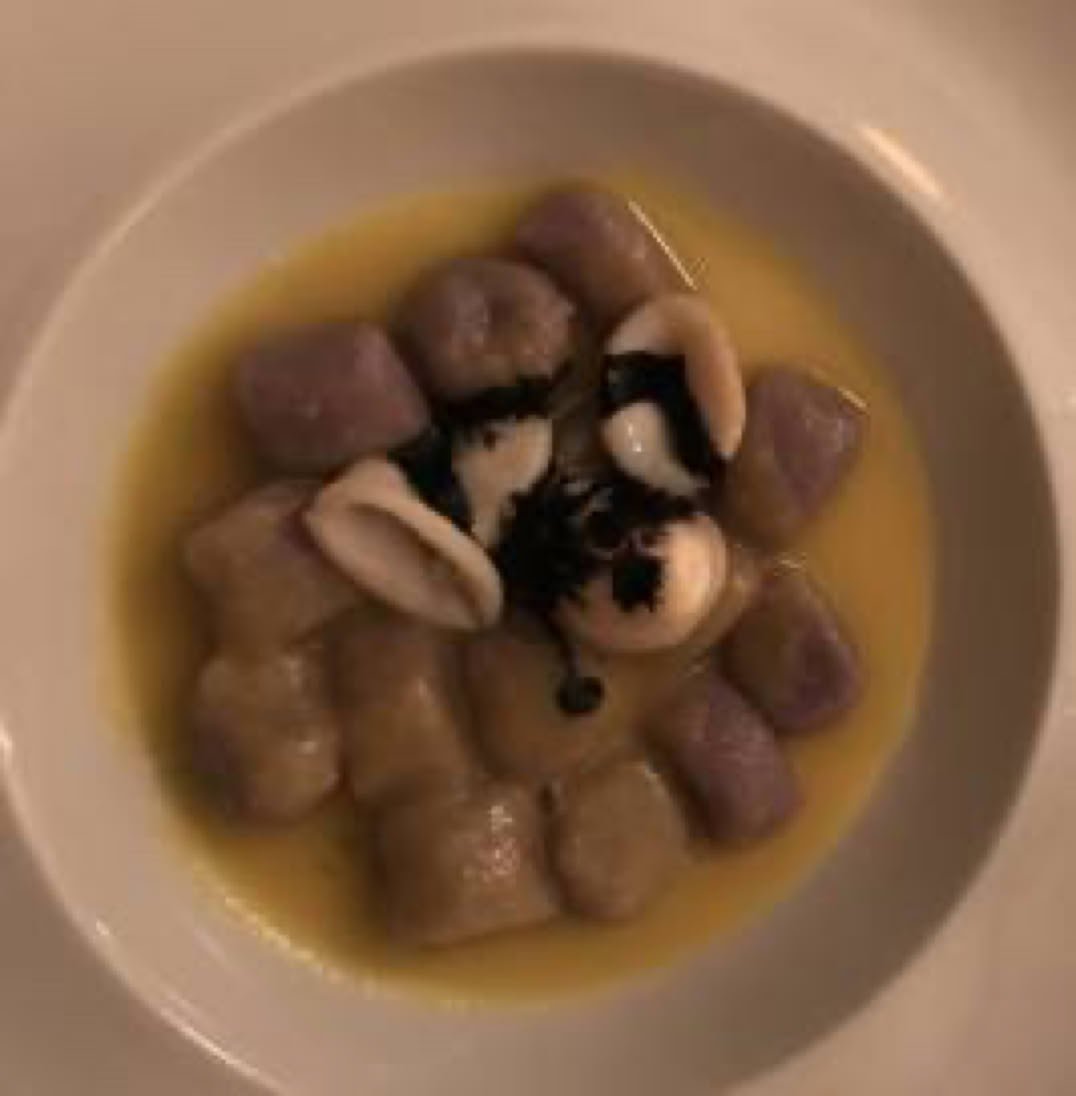 Purple potatoes small gnocchi, saffron and black inksquid calamari