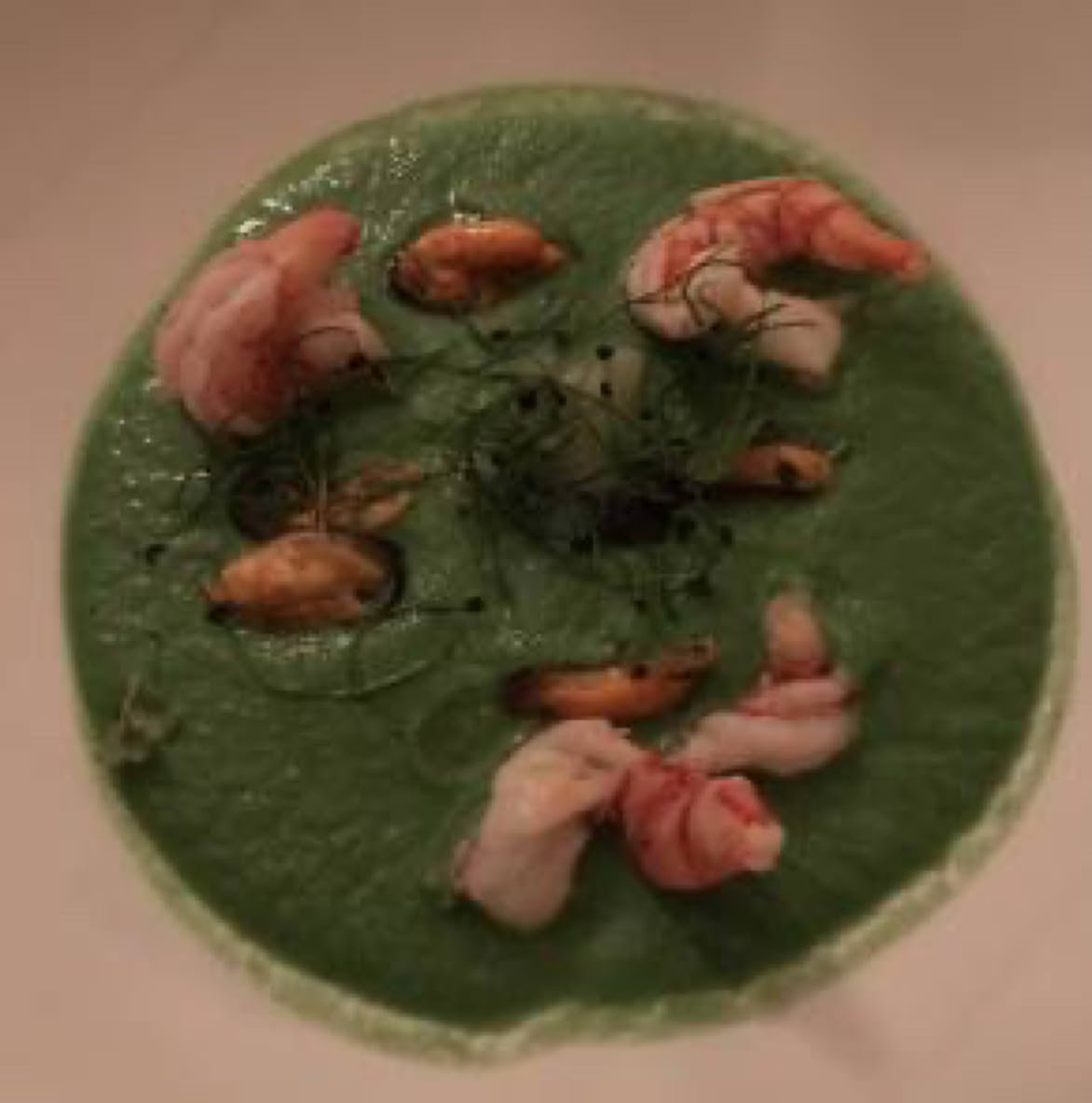 Seared purple prawns, mussels, broccolis and candied ginger