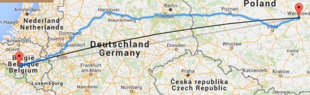 Distance Charleroi-Varsovie (en ligne droite) : 1.166 km