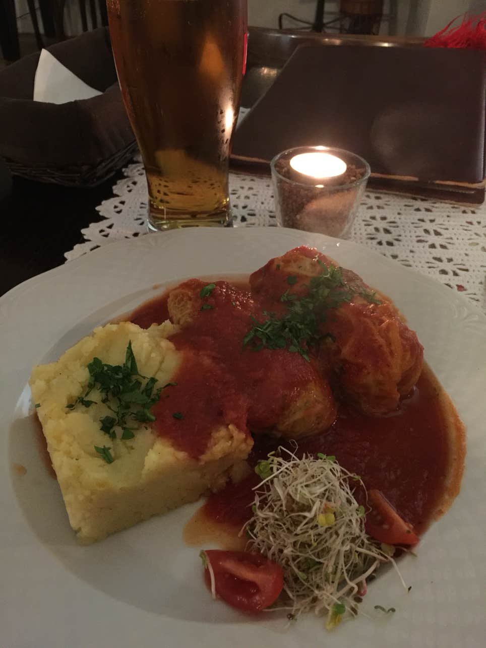Je me commande une vodka pour l'apéro et opte pour une spécialité : Golabki (feuilles de choux entourant du porc servies avec une purée et dans une sauce tomate) accompagné d'une bière locale (en version plus petite que la veille). Me laisse aller à prendre un dessert : une délicieuse tarte aux pommes.