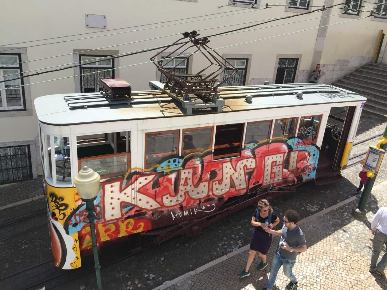 1ère étape : l'Ascensor da Glória qui relie Baixa (Place Restauradores) à Bairro Alto. Le funiculaire a été déclaré monument historique du Portugal en 2002.
