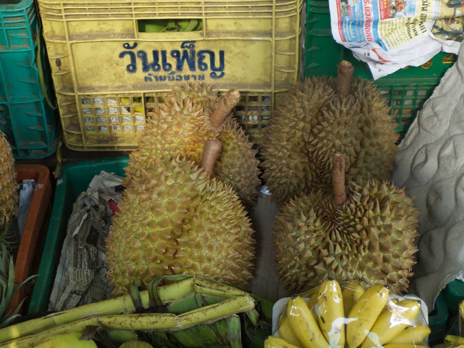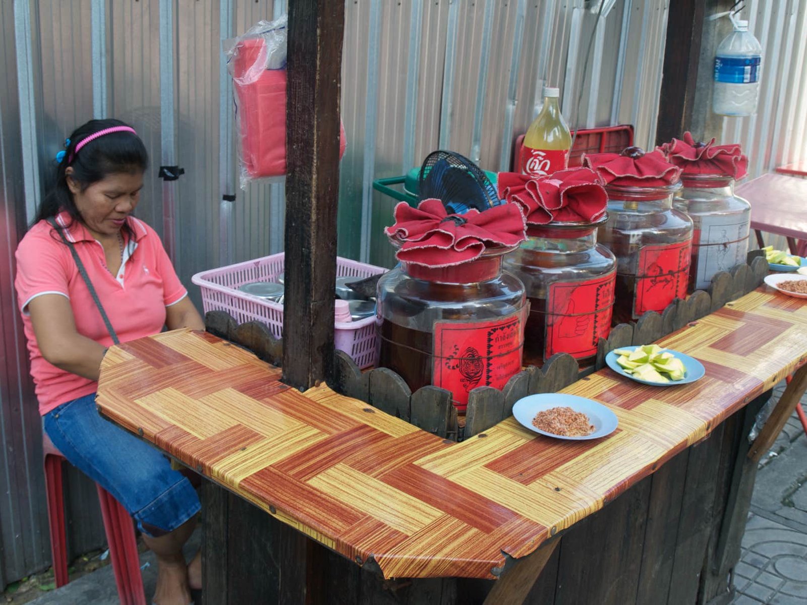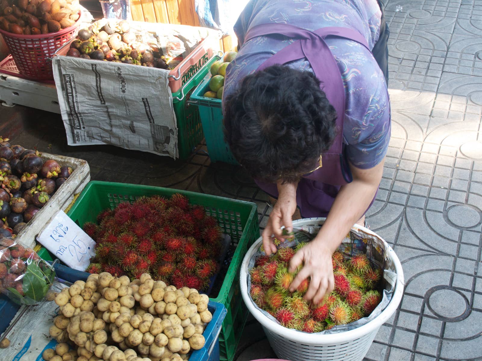 Rue de notre hôtel - Taxi (rose) - Vendeuse de fruits - Que sont ces fruits bizarres ?