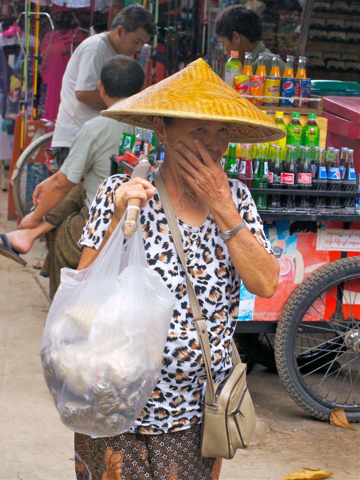 Faisons une promenade dans le marché voisin. Différence là aussi ; Sont en vente beaucoup de lunettes, de DVD musicaux, CD audio... Des mamies font la manche.