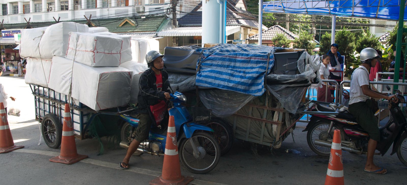 Une fois la frontière passée (la rivière qui sépare les deux pays), le sentiment est étrange. Sommes submergés par les demandes de guides, chauffeurs de taxi. Les gens sont les mêmes mais si différents. Le sourire a pratiquement disparu sur les visages. Pas de sentiment d'insécurité mais une nette préférence pour la Thaïlande.