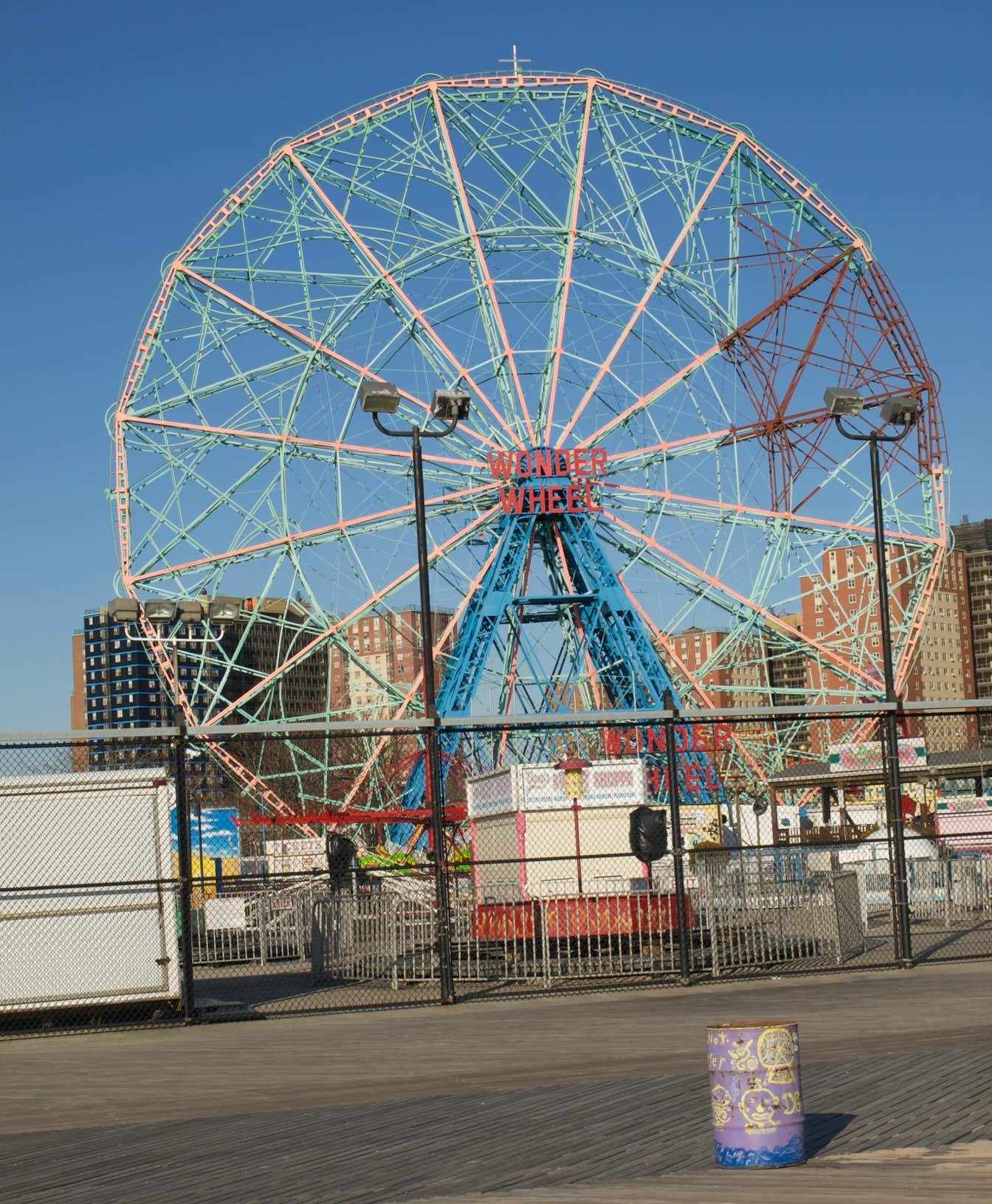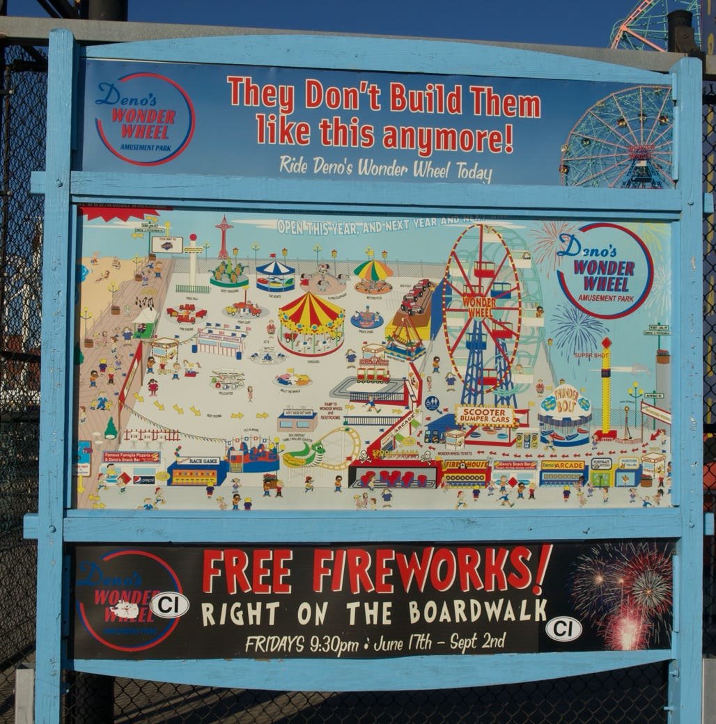 "The Wonder Wheel" (grande roue) (1920), énorme et dotée de nacelles stationnaires et mobiles. Eh oui, les petites cabines bougent et suivent un circuit, passant de l'extérieur de la roue à l'intérieur...