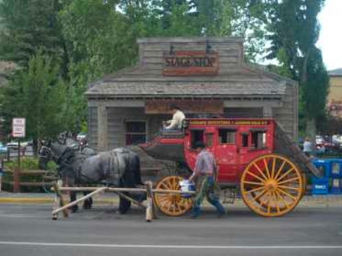 Sommes basés à Jackson Hole qui ressemble à une vieille ville du Far West. D'ailleurs, un petit spectacle de rue (cow boys, coup de flingues, bagarres) est proposé quotidiennement